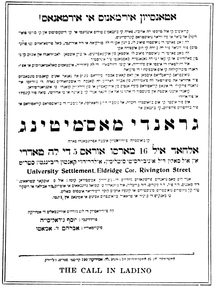 For four years New York has had a steadily growing colony of Castilian speaking Oriental Jews. The major part of them speak a Spanish dialect known as Ladino, but use Hebrew characters in writing. Knowing no English, they have lived in isolation, the largest group between Essex, Rivington, Christie and Canal streets. The rest are east of Lenox avenue in about twenty blocks north of 100th street.