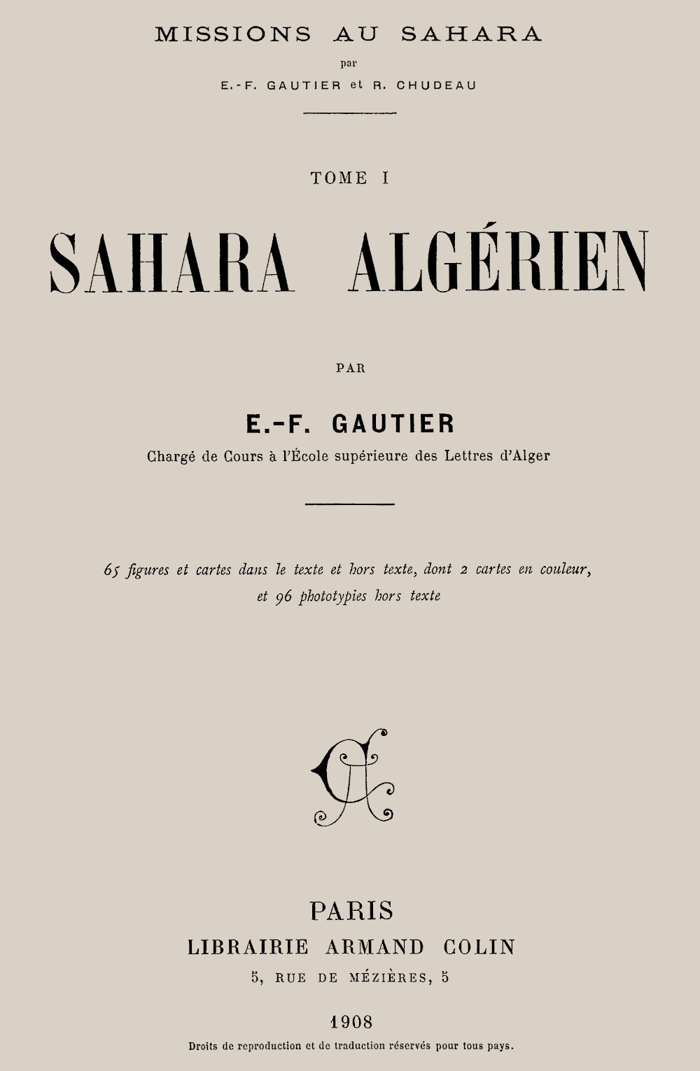 Chacun de nous a donc passé au Sahara de dix-huit à vingt mois. Il se trouve que M. Chudeau a surtout voyagé dans le Sahara soudanais, et moi dans le Sahara algérien. Chacun s’est chargé de rédiger les résultats communs pour la région qu’il connaissait le mieux. Je publie aujourd’hui un premier volume consacré au Sahara septentrional, et qui sera suivi d’un second, sous la signature de M. Chudeau, consacré au Sahara méridional.