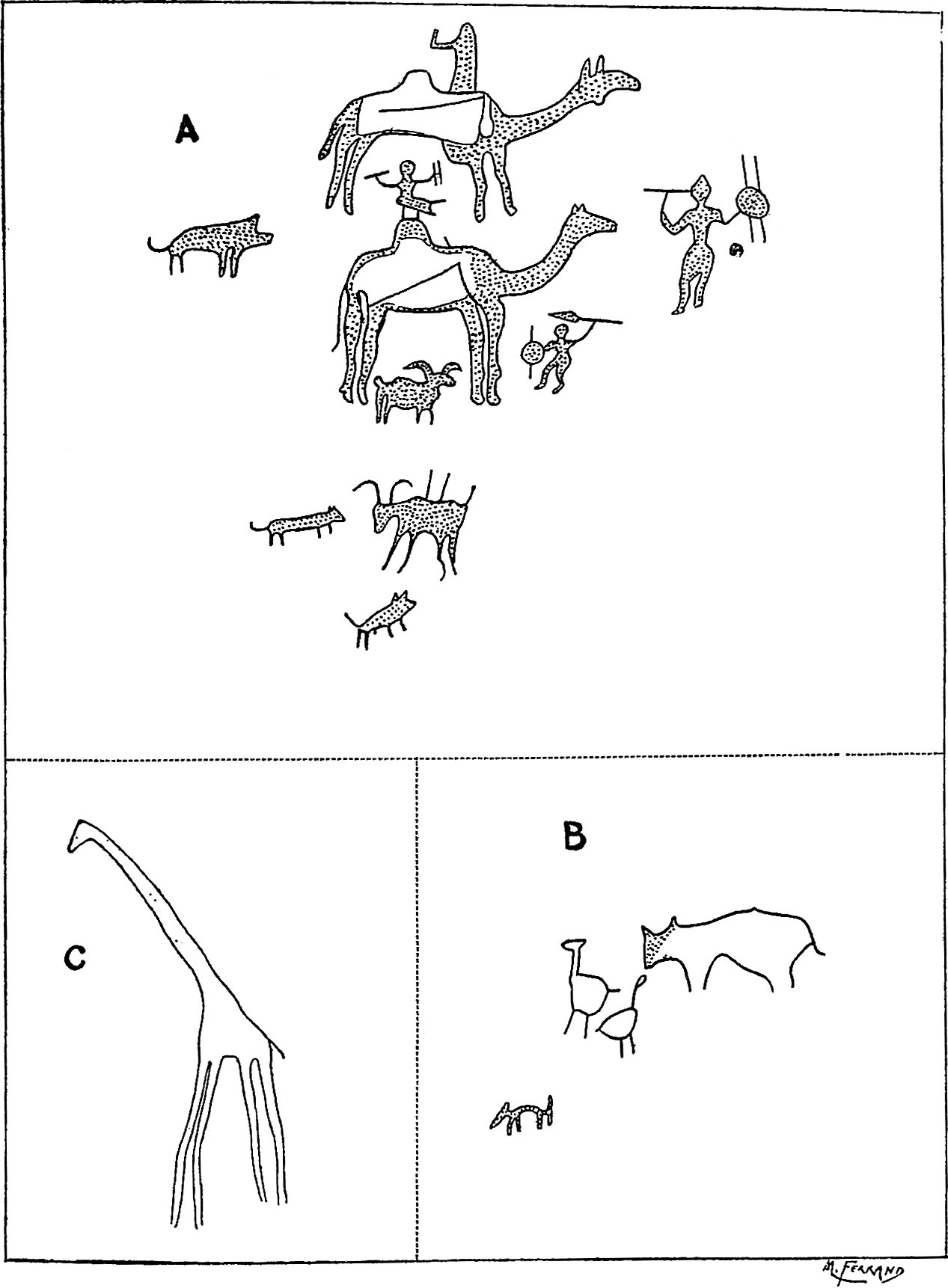 Il est bien entendu que cette division du Sahara en deux parties nous est imposée par les hasards de notre itinéraire.[viii] Nous n’avons nullement la prétention qu’elle soit géographiquement justifiée. Elle serait même absurde en géographie humaine. Aussi le chapitre III du présent volume sera-t-il consacré à l’ethnographie préhistorique du Sahara tout entier, partie soudanaise incluse. A tout autre point de vue cette division est commode, elle permet de traiter à part des questions distinctes.