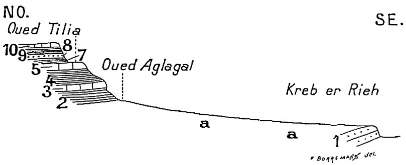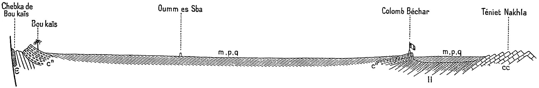 Entre le nord et le sud la nature différente des vestiges de l’âge quaternaire met une vive opposition. Dans le nord, ce sont des lits d’oueds profondément gravés ; le chapitre II du présent volume est une monographie d’un fleuve quaternaire. Dans le sud, au contraire, les traces les plus apparentes qu’a laissées le quaternaire sont des dunes fossiles. Ceci revient à dire que dans le nord le désert a succédé à la steppe et dans le sud la steppe au désert : un gros fait qui n’a jamais été mis en lumière.