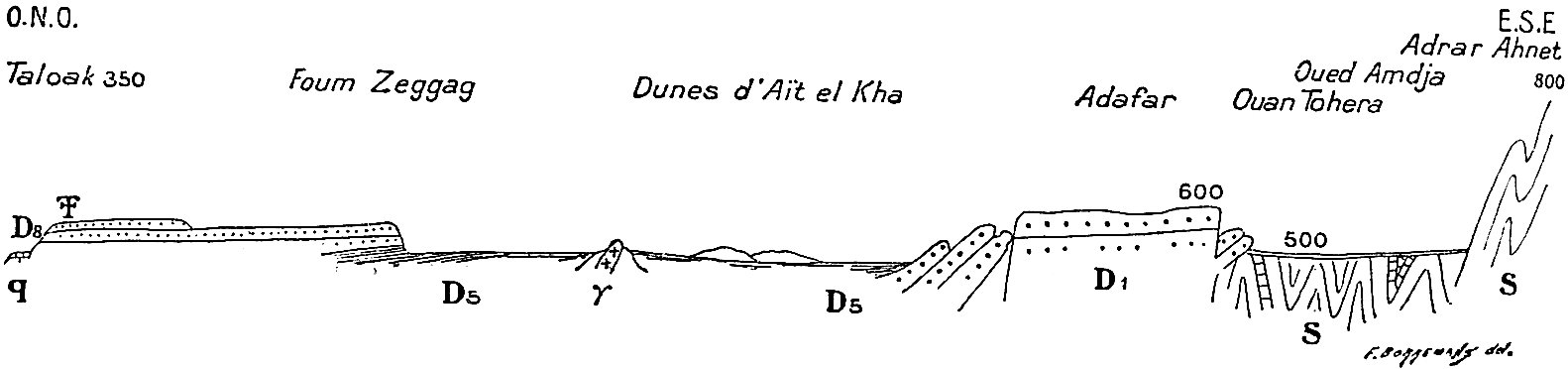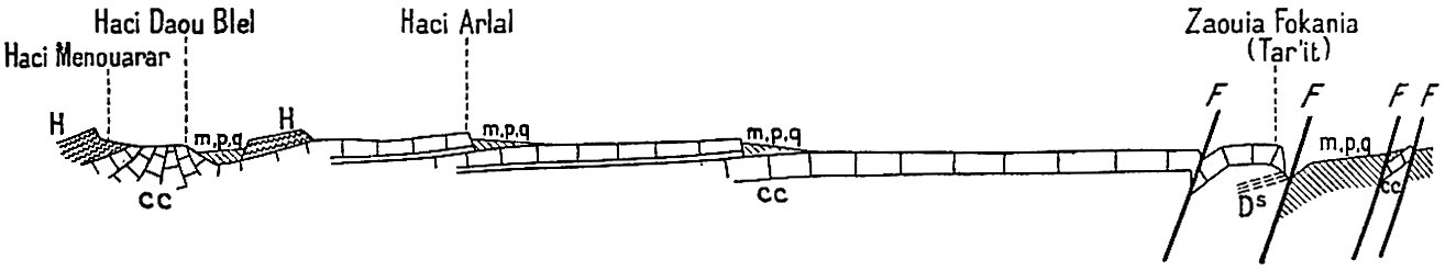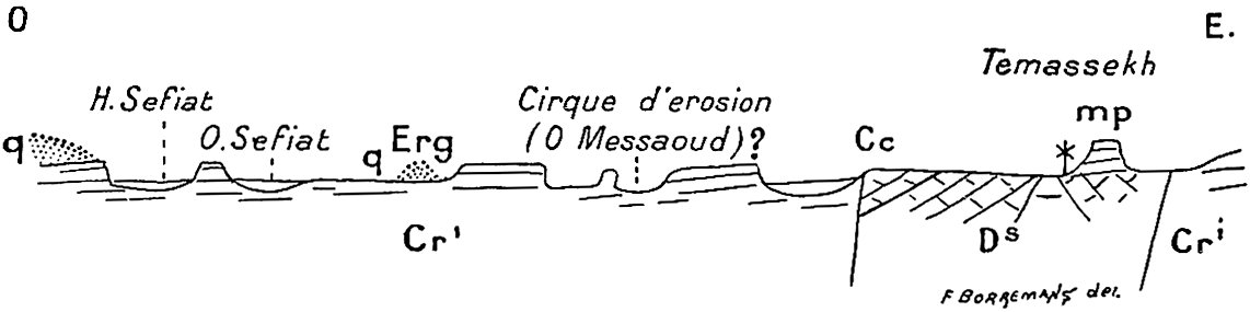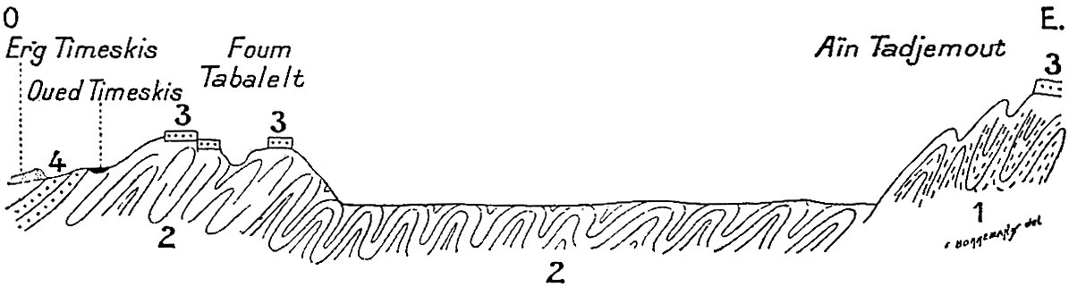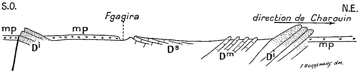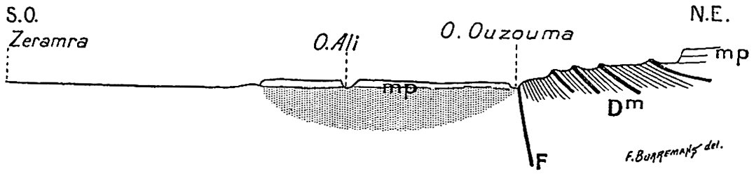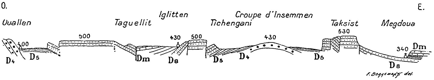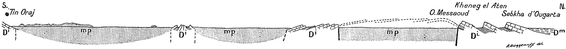 Dans un ouvrage où j’ai donné une place considérable à l’étude géologique et plus spécialement stratigraphique on pourra s’étonner que la paléontologie soit à peu près complètement absente. Pourtant un grand nombre de fossiles ont été recueillis. Ceux qui se rapportent à l’âge carboniférien, encore qu’intéressants par la nouveauté des gisements, ne nous apprennent rien de nouveau sur la faune dinantienne au Sahara. Les fossiles dévoniens en revanche sont apparemment intéressants, surtout ceux des étages supérieurs, puisque M. Haug, dans le laboratoire de qui ils ont été déposés, va leur consacrer une monographie.