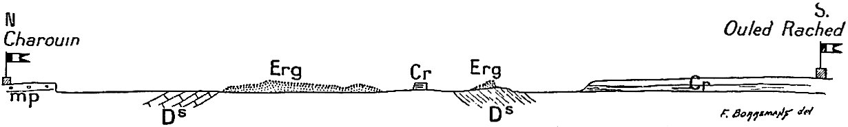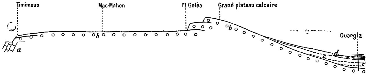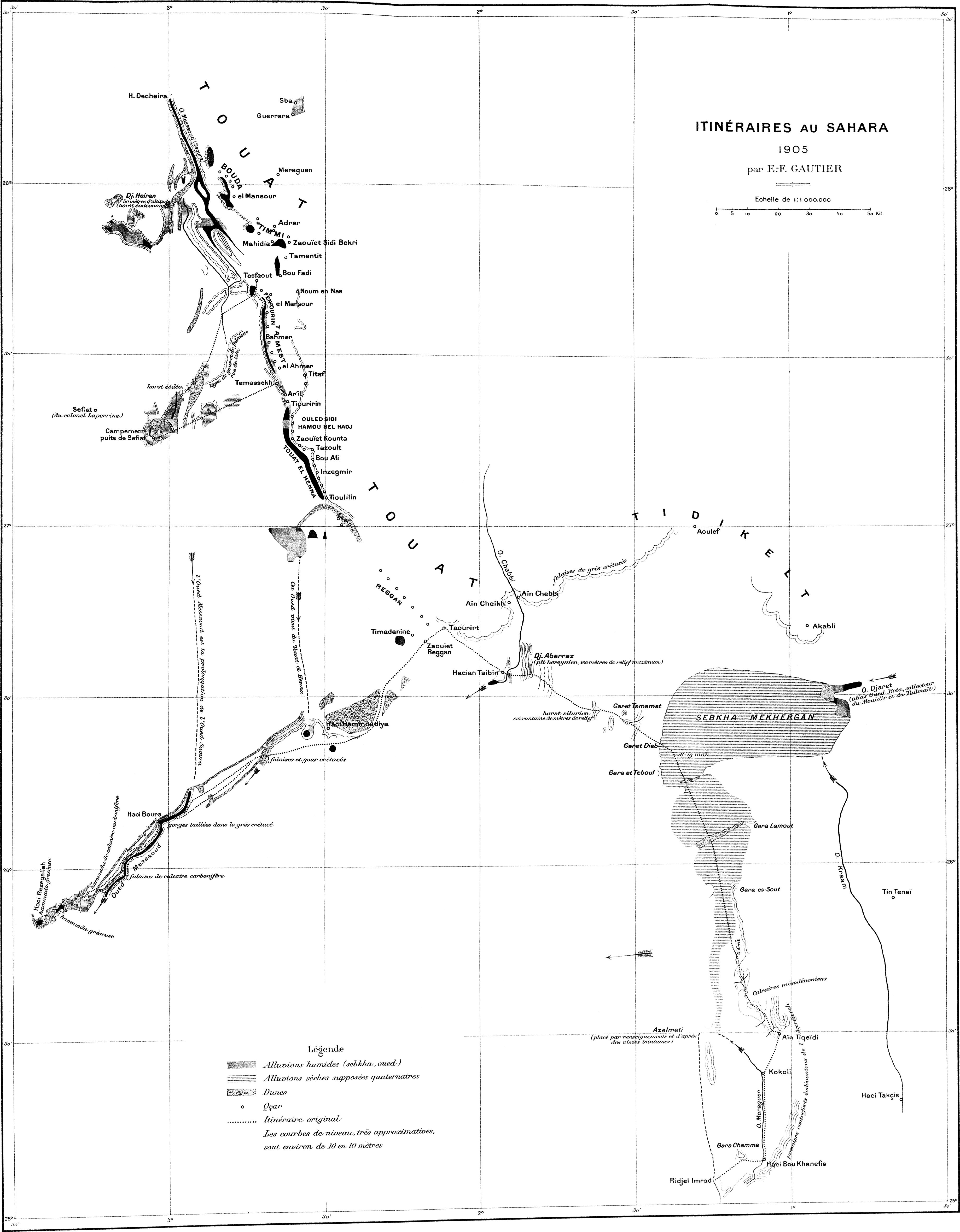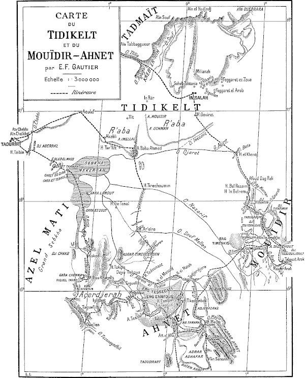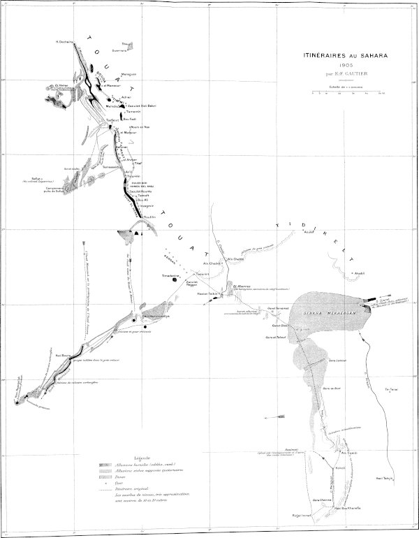 Les premiers sont relégués dans un appendice ; il est vrai qu’ils ont été utilisés pour l’établissement des deux cartes, qui accompagnent les chapitres II et VII ; il est vrai aussi que ces deux cartes font ressortir quelques faits nouveaux et intéressants (cours de l’O. Messaoud, dessin de l’Açedjerad, position[ix] d’Ouallen). Ces itinéraires originaux n’en sont pas moins une faible fraction de l’itinéraire total parcouru, et leur originalité d’ailleurs n’est pas toujours entière. C’est que les officiers des oasis ont fait une besogne topographique énorme et excellente, et qui a été en grande partie publiée. On la trouvera éparse dans les suppléments au Bulletin du comité de l’Afrique française. Elle a été synthétisée dans deux cartes récentes : Carte provisoire de l’extrême-sud au 1/800000, dressée à l’aide des documents topographiques existant dans les archives du gouvernement général par M. le capitaine Prudhomme. Carte des oasis sahariennes, 1/250000, par MM. le lieutenant Nieger et le maréchal des logis Renaud (Paris, 1904). D’une façon générale je renvoie le lecteur à ces deux cartes.