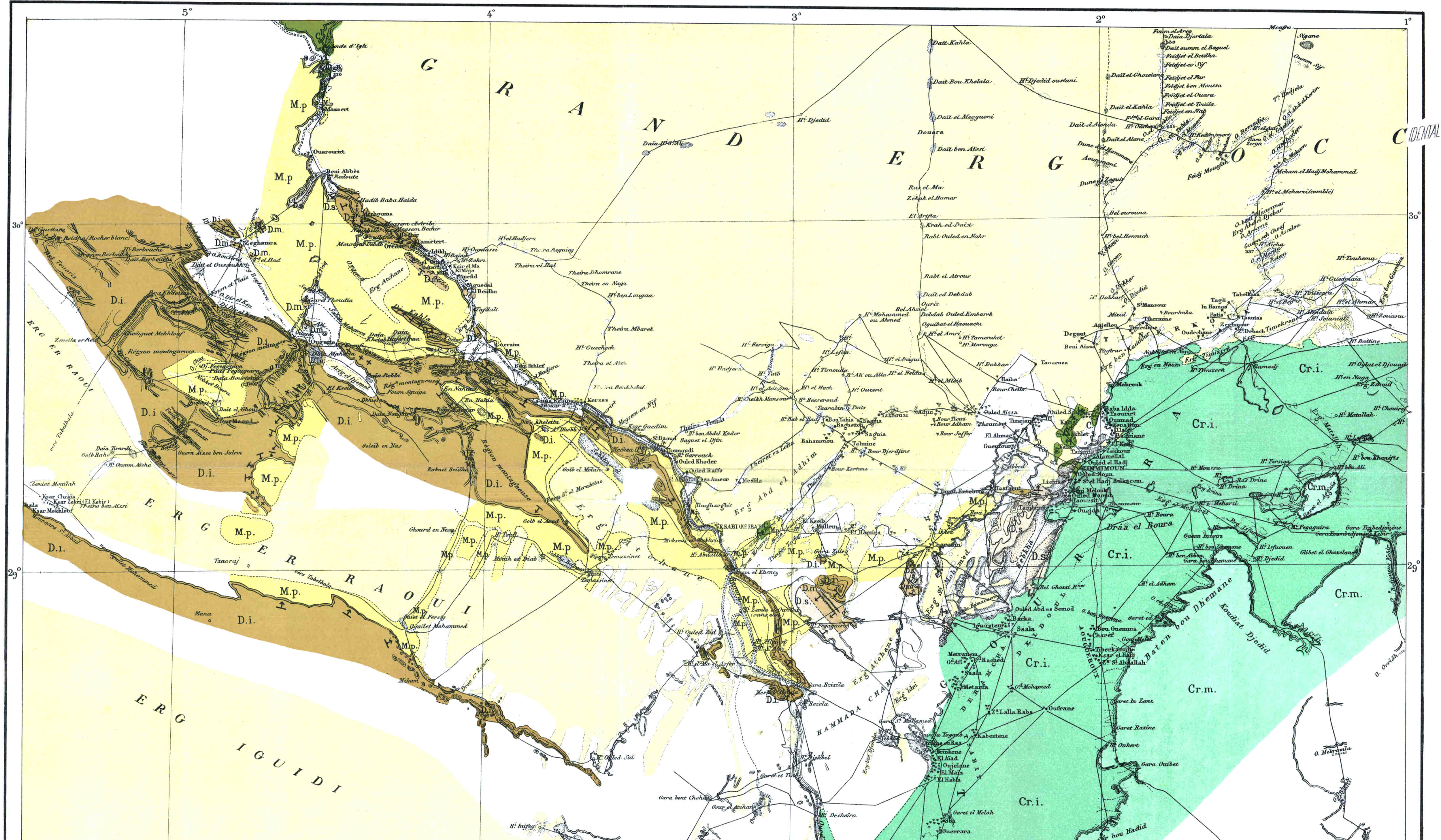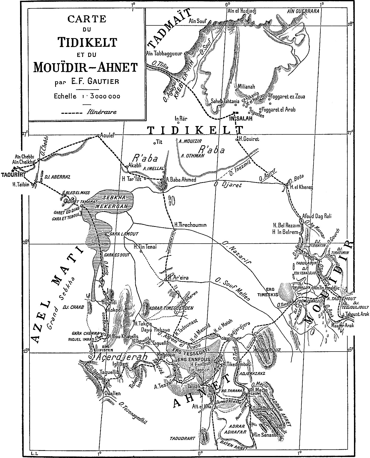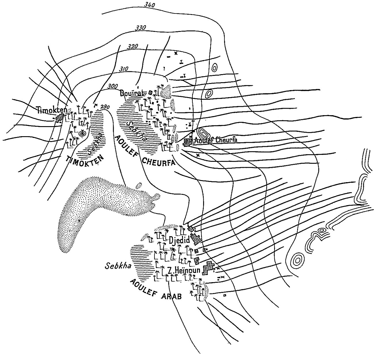 Les premiers sont relégués dans un appendice ; il est vrai qu’ils ont été utilisés pour l’établissement des deux cartes, qui accompagnent les chapitres II et VII ; il est vrai aussi que ces deux cartes font ressortir quelques faits nouveaux et intéressants (cours de l’O. Messaoud, dessin de l’Açedjerad, position[ix] d’Ouallen). Ces itinéraires originaux n’en sont pas moins une faible fraction de l’itinéraire total parcouru, et leur originalité d’ailleurs n’est pas toujours entière. C’est que les officiers des oasis ont fait une besogne topographique énorme et excellente, et qui a été en grande partie publiée. On la trouvera éparse dans les suppléments au Bulletin du comité de l’Afrique française. Elle a été synthétisée dans deux cartes récentes : Carte provisoire de l’extrême-sud au 1/800000, dressée à l’aide des documents topographiques existant dans les archives du gouvernement général par M. le capitaine Prudhomme. Carte des oasis sahariennes, 1/250000, par MM. le lieutenant Nieger et le maréchal des logis Renaud (Paris, 1904). D’une façon générale je renvoie le lecteur à ces deux cartes.