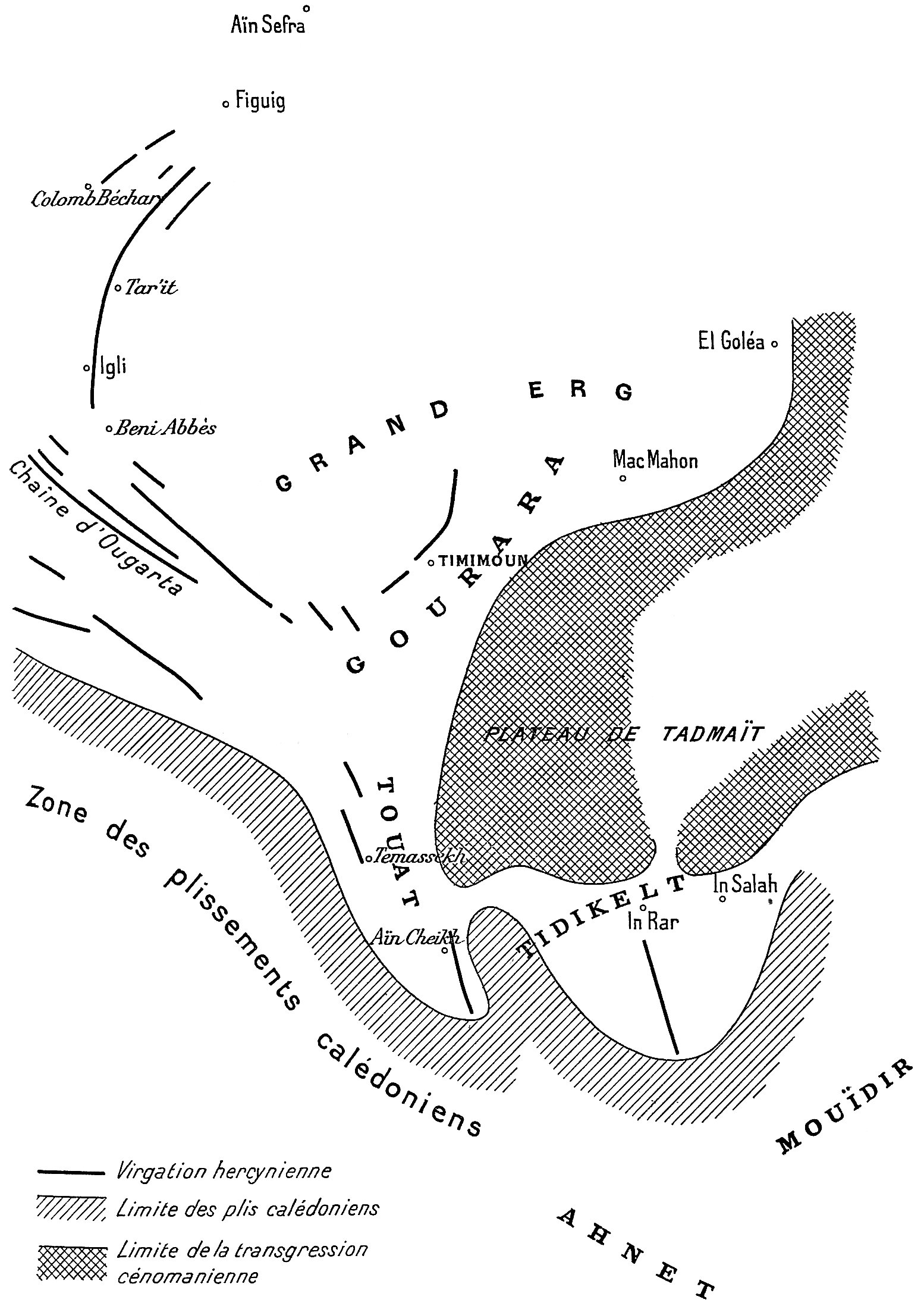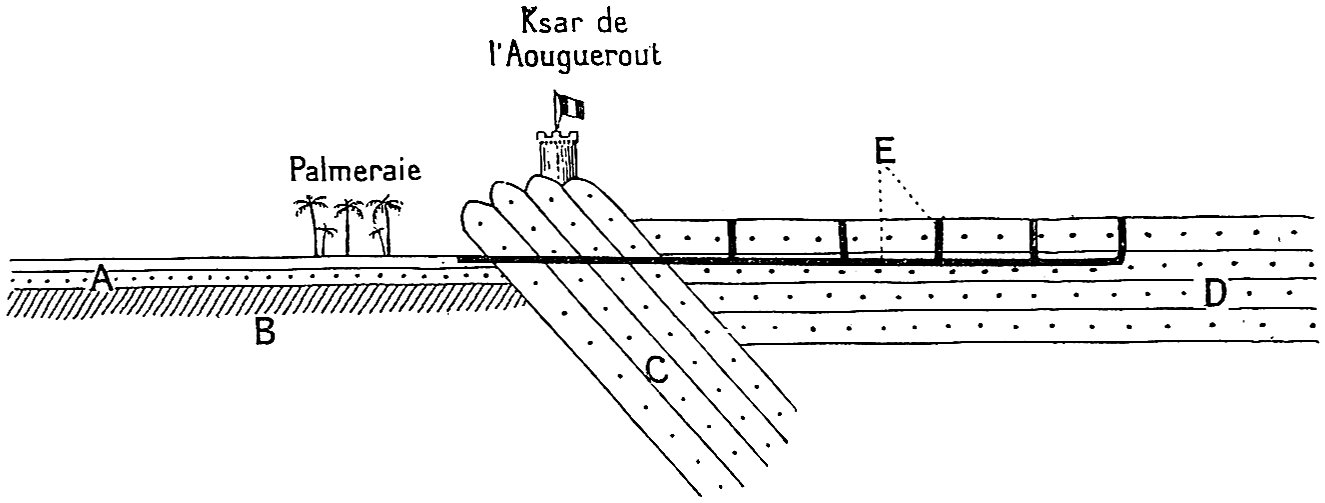 | Les sols (hammada — reg — erg — sif — feidj ou gassi — nebka. — Sol de Timchent), 3. — Forme du terrain (gara — baten et kreb — moungar, tarit — chebka), 8. — Hydrographie (l’oued — sebkha et chott — maader — haci — aïn — r’dir ou aguelman — tilmes abankor — medjbed — tanezrouft), 10. | |