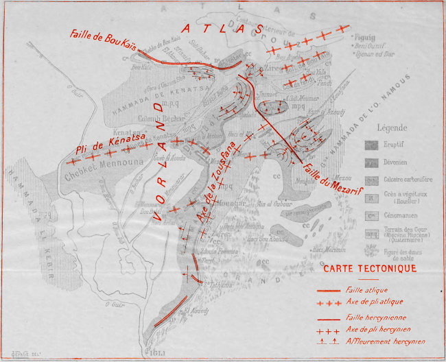 | Géologie du Touat, 227. — Éodévonien, 227. — Dévonien moyen et les ktoub, 228. — Carboniférien de Temassekh, Tazoult, Aïn Cheikh, 229. — Plissements hercyniens, 230. — Crétacé, 232. — Mio-Pliocène, 234. — Les failles, 235. | |