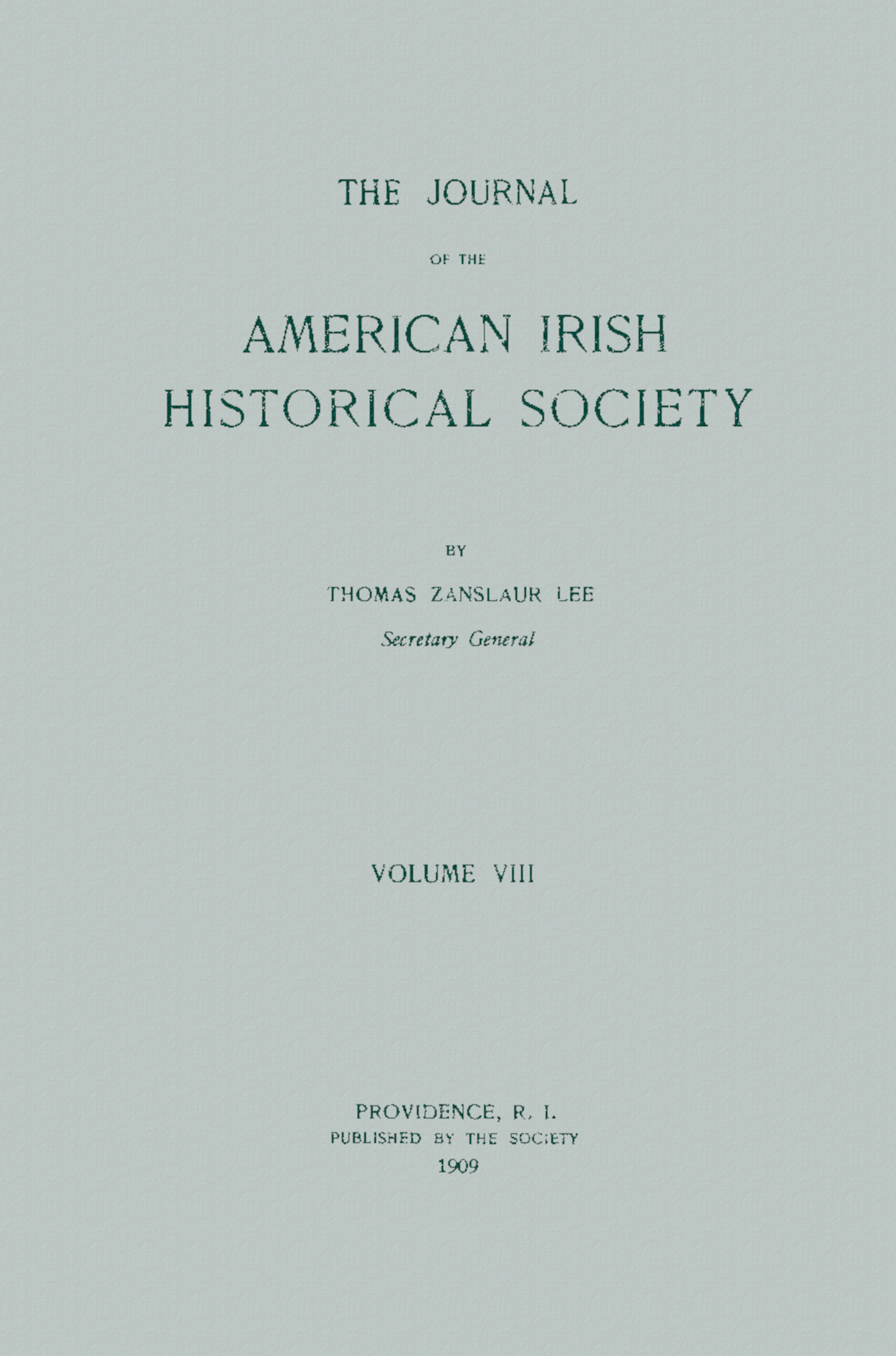 With the hope that we have succeeded in some measure in living up to the high standard set by our honored predecessor, Thomas Hamilton Murray, in the compiling of the Journal of the American Irish Historical Society, we beg to offer Volume VIII.