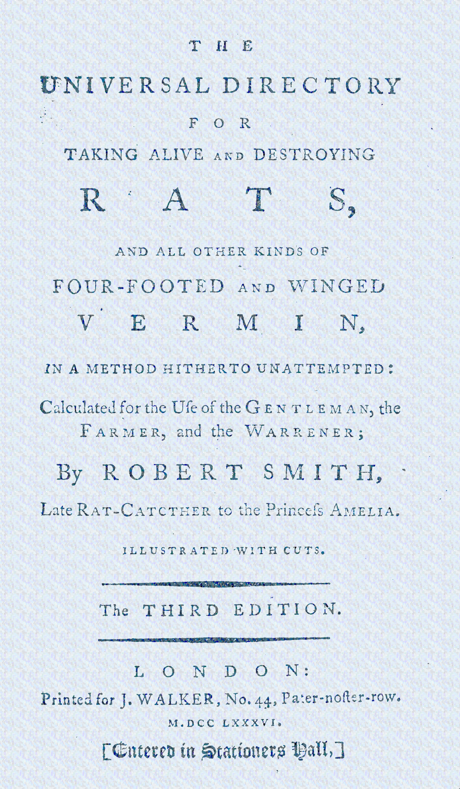 And as most noblemen, gentlemen, and others, who have country seats are generally, if not constantly, troubled with various kinds of vermin, greatly detrimental and destructive to their property in the following instances, viz. in many places where gentlemen have hare-warrens and pheasantries, they are troubled with foxes, their waters with otters, those great destroyers of fish; their poultry are killed by polecats, stoats, and weasels; in other places they are pestered with wild cats, who originally strayed from the farm and other lone houses, and running into the woods, breed in great numbers and do incredible mischief, in destroying the game, poultry, rabbits, and young leverets; in many other places they are troubled with sheep-killing dogs, who in the night-time worry and kill great numbers of sheep, so useful and necessary to the commonwealth, and the staple viicommodity of the kingdom. But of all the noxious animals none do more mischief than rats; both the old English black rat and the Norway rat, especially the latter, which is the most mischievous animal in the creation. In all the above cases, rules, not drawn from theory, but from twenty years strict observation and practice, are laid down in the plainest manner, to find out their haunts and hiding places; with the easiest methods how to take and destroy them, to the great joy and emolument of the persons who have been injured and pestered with them. Rules for taking and destroying moles and mice are likewise given, and the nature of ferrets is also described, with instructions when it is proper to make use of them, and when not.