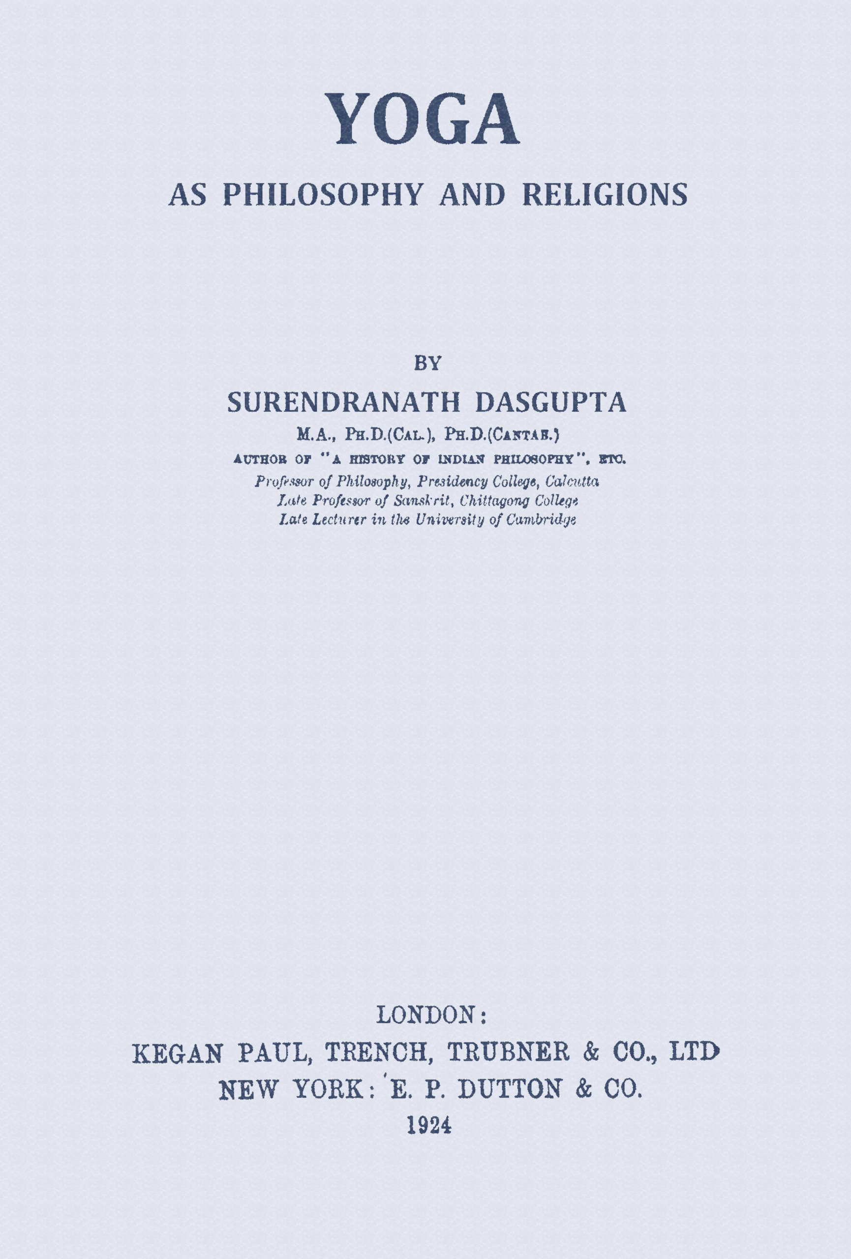 Last of all, I must express my deep sense of gratefulness to Sir Ashutosh Mookerjee, Kt., C.S.I., etc. etc., and the University of Calcutta, for kindly permitting me to utilize my A Study of Patañjāli, which is a Calcutta University publication, for the present work.