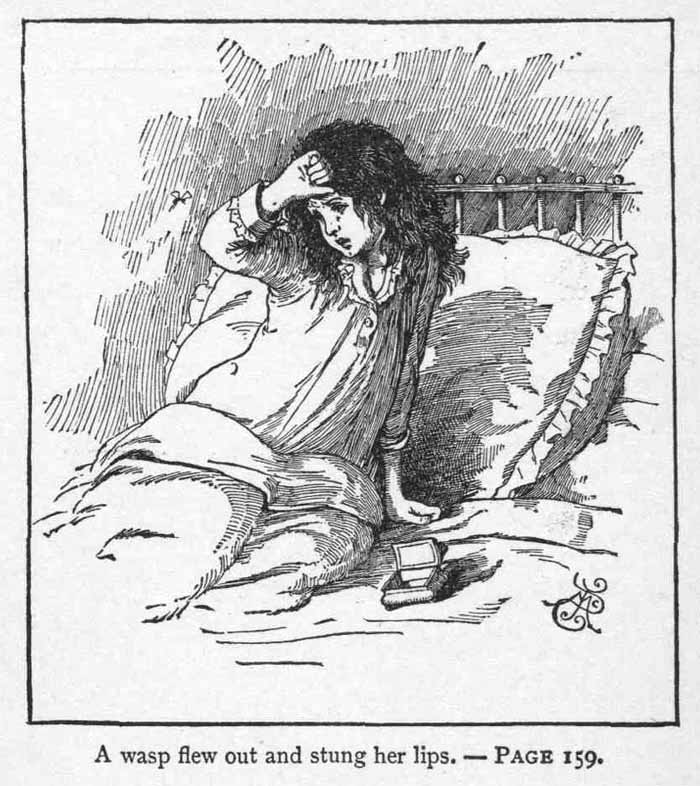 {Illustration: A wasp flew out and stung her lips.}