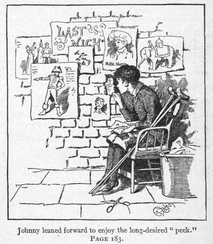 The old cobbler next door enjoyed reading the anecdotes on Sunday when he could not work; the pale seamstress upstairs liked to look over advertisements of the fine things which she longed for; and Patsey Flynn, the newsboy, who went by each day to sell his papers at the station, often paused to look at the play-bills,—for he adored the theatre, and entertained Johnny with descriptions of the splendors there to be beheld, till he felt as if he had really been, and had known all the famous actors, from Humpty Dumpty to the great Salvini.