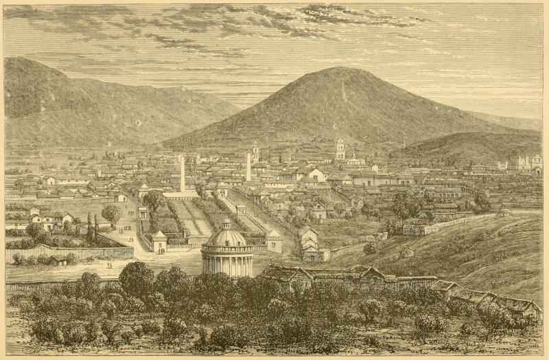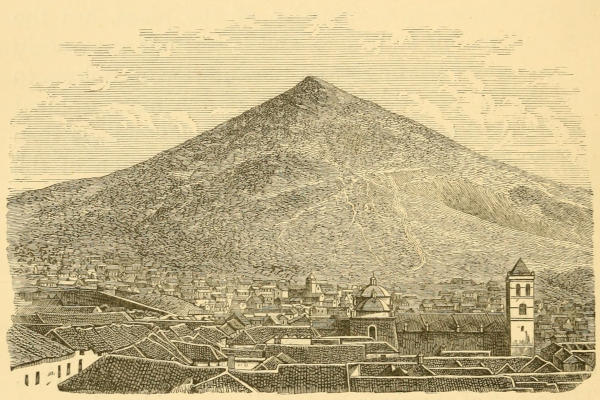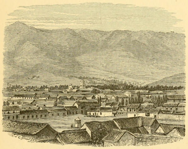 From the material of which the houses are composed, the town and its environs have a strange and somewhat dull and heavy appearance, notwithstanding that the houses are mostly built as lightly as possible, in order the better to withstand the frequently occurring earthquakes. The walls are generally lath, plastered over with mud, or adobes, one brick in thickness; and the roofs are also of mud, tempered so well that even the intense heat of the sun does not cause it to crack. These roofs are made in a very peculiar shape, and generally the houses have quite the appearance of toy houses; but at night, when the windows are opened and the interiors well lit up, they look very cheerful and lively. The streets are broad and kept very clean, with gaslights in the principal ones. The plazas are neat, though small, and there is a prettily arranged garden with an elegant cast-iron fountain in the principal square, where the “society” of Tacna meet in the cool of the evening to enjoy a promenade, enlivened by the strains of a military band.
