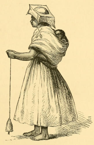 The Indians of Llollia and the district are of the Aymará race, and are strong and well built generally. In their own way they are certainly industrious, for it is very unusual to meet either a man or a woman who is not spinning, whether indoors or out of doors, seated or walking. They are all owners of large flocks of sheep, whilst many of them also have droves[361] of llamas and alpacas, the last of which are said to yield large profits from the sale of the famous alpaca wool. Both men and women wear nothing but dark blue homespun clothing, with stockings of the natural colour of the wool. The men wear their hair long, twisted round the top of their heads in small and narrow plaits, which have very much the semblance of plaited horse-tails. They are scarcely ever seen without the universal poncho over their shoulders. The women wear a countless number of woollen petticoats, which are puckered up round about their waists in a most elaborate manner, and, reaching[362] about half-way down the calf of the leg, display a pair of ankles and feet which, to all appearance, might be made of bronze or copper. A square of woollen cloth, or shawl, is worn tied round the neck, secured in front by a couple of spoon-shaped skewers; whilst, generally at their backs, a baby is seen stowed away in the folds of the shawl—for babies are almost as numerous in the hovels on the tops of the Andes as they are in some of the back slums or courts of St. Giles. Their head-dresses are also peculiar, being something mediæval in shape and look. A frame of straw is made up in form of a lozenge, with a hole in the centre to fit the head, and this is covered with dark blue or red cloth; a curtain hanging down on all sides about six inches deep, making a capital sort of sunshade. One would not think that the women required any protection from the sun’s rays, for their faces are like their hands and ankles, of a deep brown colour, from the accumulated dust of years; whilst a red glow, that the cold winds give them, aids the semblance of their skins to well-seasoned mahogany. Washing of any sort is unknown on the higher Andes, where the strong cold winds makes even a traveller feel inclined to follow the universal custom, and let well alone.