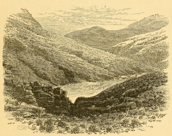 Passing the cuesta and arriving again on flat lands, we crossed a river called El Rio de Azufre, the water of which has a most unpleasant taste and smell, the latter reminding one of the odour exhaled by rotting seaweed. The banks of this stream were encrusted with a yellow deposit, whilst the bed also was covered with a bright yellow slime. This stream is the last that runs eastward, and soon after crossing it the track comes to the highest point over which the road to Tacna passes. Before descending, one notices to the northward, deeply indented on the side of the peak of Tacora, the aqueduct which conveys the water of the river Maury, an affluent of the Desaguadero, to the town of Tacna. This pass, which is called Chulancani, is surmounted by a huge cairn, or “apacheta,”[380] composed principally of the bones of the mules and donkeys that have fallen victims to the soroche. To this heap every passing arriero adds either a stone or a whitened bone, picked up from the way-side, and devoutedly crossing himself, prays to the Holy Virgin or to his patron saint for a safe passage to his home. Close by the cairn, which stands probably at an elevation of rather more than 15,000 feet above sea-level, grows a rough and gnarled tree of the kind called “kenña” in the district, and forming a remarkable feature of the route.