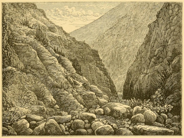 After crossing the summit of the pass the descent to the Pacific coast is commenced, and the steep nature of the western slope of the Andes becomes conspicuous at once. Indeed the whole aspect of the country changes, for there are no more pampas or table-lands in sight, and no grass or other signs of vegetation. Owing to the almost total absence of rainfall, nothing green or growing is to be seen on the western slopes of the Andes, except in the bottom of the ravines, where, by skill and hard labour, some industrious “ranchero” has been able to effect a little irrigation. Owing to the broken and ravined character of the hill-side but a short view is to be obtained, from which one would almost be inclined to fancy that the mountains had split asunder; the part towards the Pacific having, as it sank down, broken up into inextricable confusion, whilst the bulk, remaining unshaken towards the interior of the continent, preserved its original formation of valley, plain, and hill.
