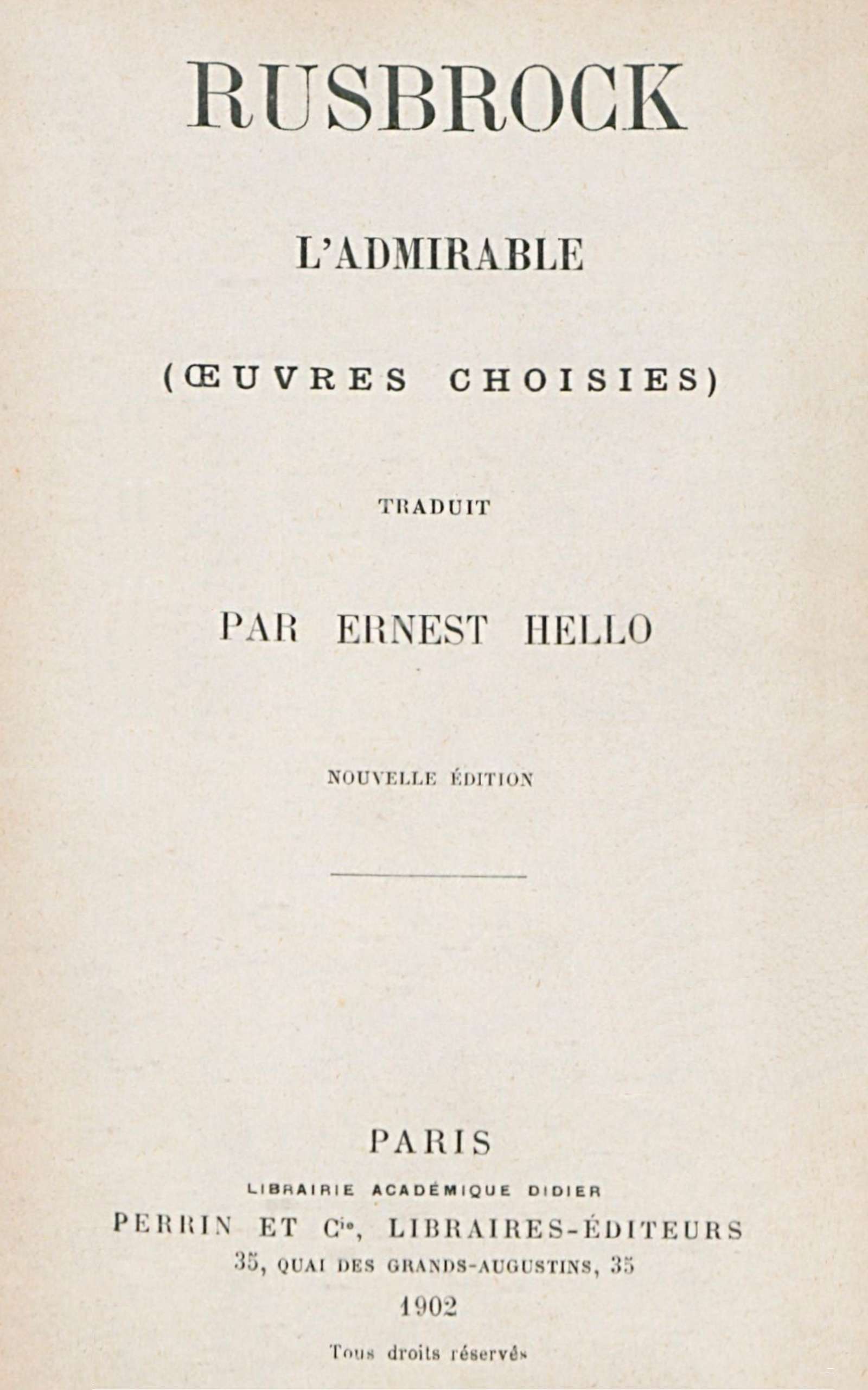 J’ai cherché dans les siècles passés ceux qui ont réfléchi dans leur cœur ; j’ai cherché parmi ceux qui ont vécu dans l’Esprit-Saint. Car, ailleurs, je n’avais aucune chance de rencontrer ce que je cherchais. Ayant trouvé plusieurs grands personnages qui avaient fait ce que Jérémie demande, j’ai offert, l’an dernier, aux hommes du XIXe siècle, la bienheureuse Angèle de Foligno ; cette année, je leur présente Jean Rusbrock, celui que les siècles passés ont surnommé l’Admirable, et que le siècle présent a laissé en oubli.