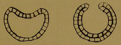 A step higher in the animal scale, or a further advance in the development of the schematic embryo (depicted in Diagrams 3 to 6), and we find that these special digestive cells are losing their sturdier qualities and being placed in a position protected by cells which have specialized in another direction. This is shown in Diagram 4, where the hollow ball of cells which resulted from the repeated division of one cell is represented in section. One side of the ball is pushed in, and now the beast consists of two layers of cells, an outer protecting and an inner digesting (Hydra and sea-anemone). Soon, however, it[18] is found more convenient to have a tube for digesting food, for then different substances can be digested and absorbed in different parts; and the refuse, of which the animal can make no use, need not be brought back to the mouth to be got rid of.