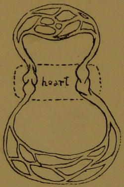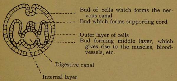 This, however, requires a number of other changes in the structure of the animal, which are roughly shown in Diagrams 5 and 6. It is not to our purpose here to discuss the development of animals or an animal; but the figures are worth glancing at, as they show not only how certain of the cells are set apart for digesting food, but also that a large body consists really only of a mass of protoplasm, composing kindred cells of common origin.