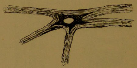 Perhaps the most interesting part of the whole body is that little band of the cortex running upwards from behind the temple to the crown of the head, in which (cf. Diagrams 64, 65 and 66) the motor areas of the limbs, and the perception of those sensations which we have grouped together and called ‘touch,’ are situated. The minute structure of this region is roughly shown in section in Diagram 67, as it has been made out with the microscope; but only a few of the nerve cells are shown, the connective tissue of feltwork in which they are suspended, and the bloodvessels by which they are nourished, being left out. All the structures represented are of course very, very small; the large black patches which represent cells would really be invisible, and the whole field of the diagram only a mere speck, to the naked eye.