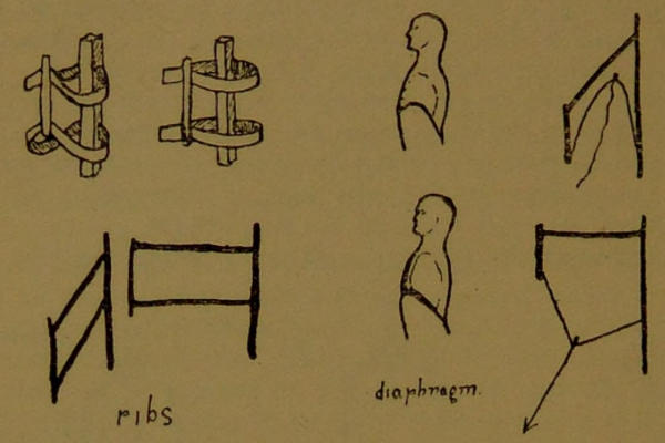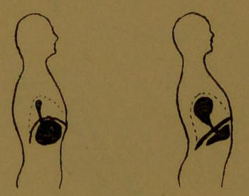 The bones of the skeleton do not rest one upon another; they are jointed, and kept slung in position by springing bands of muscle attached to their levers. If these muscles are not properly developed, they tire under the strain of holding the frame up, and a disastrous rearrangement of the organs is made to save labour. The chest is drawn in, the hips and knees thrust forward, and the man stands with cramped chest, compressed viscera, and his diaphragm under dire constraint. The result of the redistribution of weight is that his bones tend to rest upon one another like a column of bricks, and his whole weight is upon his heels. Such an individual cannot walk; he stumps along, jarring his whole body at every step.
