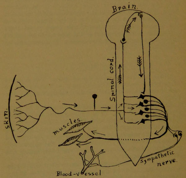 Close by the respiratory centre is the centre which controls the circulation. But enough has been said in[83] the section on reflex action, wherein the process of fainting was described, to give an idea of the part it plays in the body; so it need not detain us here.