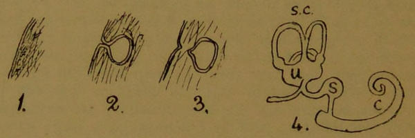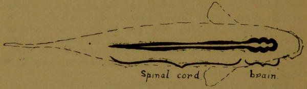 In the first essay we saw that the basis of life was chemical, and in the second that the materials necessary[80] for the chemical action, or food, must, in the higher animals, be taken into the digestive tube through the opening which we call the mouth. Therefore, as it is highly important that only the most beneficial substances shall be received into it, and that all which are actively injurious shall be excluded, it is plain that the organs of chemical perception must be placed in its neighbourhood—the organs of smell to enable the mouth to find its food, and the organs of taste to aid in selecting it. As, moreover, our humble ancestors, the fishes, move literally mouth foremost, it is not surprising to find the organs of space perception, the eyes, also situated in its neighbourhood, especially when one considers that their food is often of a lively character, and requires precision of movement to secure it. The inevitable consequence of thus grouping the more important organs of perception under the fore-end of the neural canal is that it grows and develops more highly here than elsewhere along its length, and soon is in a position to dictate to the rest of the body. Another reason why it must develop is that it must contain centres for turning its impressions to practical account, not only by producing complicated movements in the jaws, eyes and gills, but also by ruling the centres in the cord, and instructing the body to carry the mouth whither it needs to go.