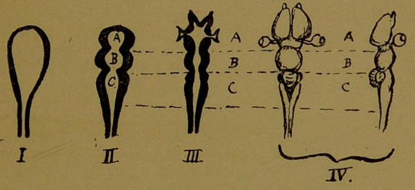 With a passing mention of the cerebellum, the three-lobed organ shown in Diagram 61, and seen again in a more advanced stage in Diagram 63, we may dismiss the two hinder divisions of the brain.