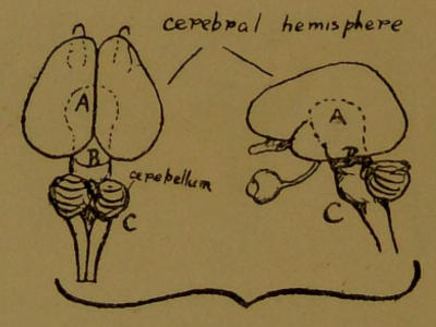 Our knowledge of the whole brain is very far from complete. We should like to know the peculiar function of each little group of cells that can be made out under the microscope, and the paths of all the fibres connecting the different parts of the nervous system. As it is, we have to wait with the best patience we can while they are being investigated, and hope. In few departments, however, have the labours of the physiologist proved more fruitful and interesting than in the study of the fore-brain (A in the diagrams).