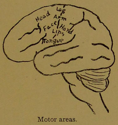 Such experiments were, of course, first made upon animals, but they have been fully verified on the human subject. The story of how this was done is not, however, a romance with a martyr or a criminal for the central figure. The corpus vile was not provided by a volunteer, or kidnapped and bound in a dark cellar, but treated as a patient in the airy wards of a hospital. With increasing knowledge of the brain, it was found that epilepsy was cortical in origin. A little piece of the cortex becomes diseased and hyperexcitable. The sufferer suddenly becomes acutely conscious of one of his members—a hand or a foot, say—not because there is anything the matter with it, but because the corresponding area in the brain is morbidly active, and he refers the sensation to the part from which it receives its nerves. The next moment the limb begins to twitch, and the excitement spreading, as in the experiment we described above, to other centres which are not diseased, they, too, become[90] morbidly active, and the whole body is thrown into convulsions. This is a disease which must be checked as soon as possible. The surgeon accordingly lays bare the part of the brain affected, knowing now where to look; finds the exact spot which is diseased by reproducing the first twitchings of a fit by electric stimulation, and removes the source of the trouble.