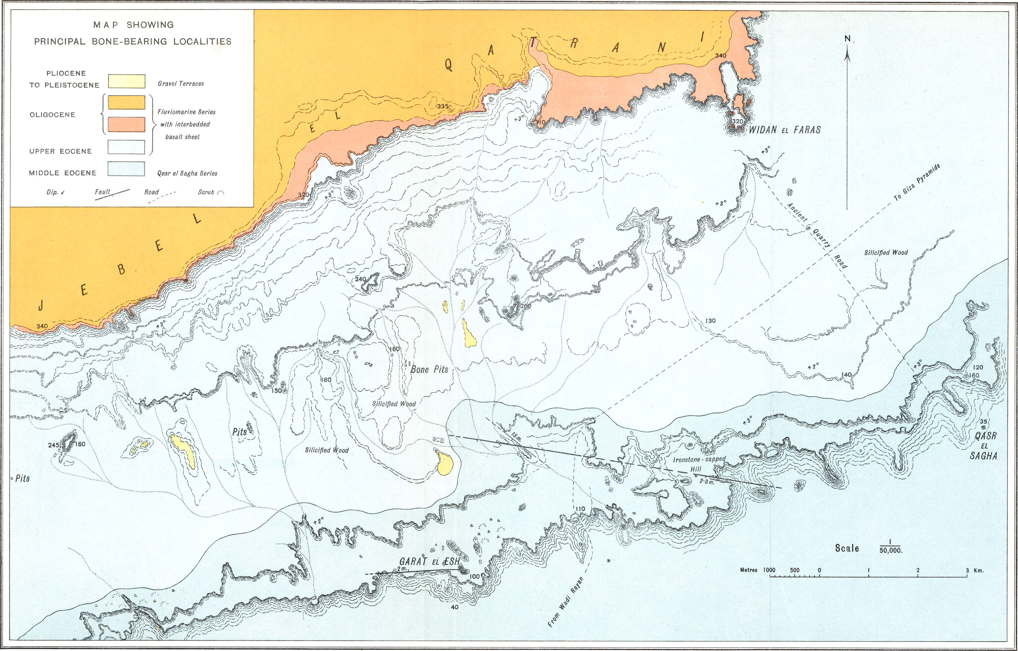 | E.—Fluvio-marine Series.—Nature of sediments, Interbedded basalts in upper part. Character of its invertebrate fauna. Conditions of deposition of series. Continuance of similar conditions to Miocene and even Pliocene times. Bone-beds at base of series. Association of skeletons of animals and forest trees. Preservation of remains. Analysis of fossil bones. Relation of Fluvio-marine series to underlying stage. Characteristics of the group. Its development in the field. Its slight development at Elwat Hialla. Section near Elwat Hialla. Constant northerly dip. Organic (molluscan) remains 9 and 14 kilometres north of Qasr el Sagha. Detailed section from near Qasr el Sagha to Widan el Faras. Determinations of mollusca from the series. Tripartite character of the series west of Widan el Faras and Qasr el Sagha. Occurrence of calcite, gypsum and chalcedony. Tabular chert and flint. Ancient workings. Extent of basalt. Silicified trees | 53 |