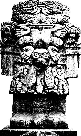 A word may now be said concerning the “Toltec” culture of the Mexican valley. The fact that this is related to the early culture of the Maya is, as said before, obvious. Many points of similarity exist in religious symbolism, art (such as the interlaced trapezoidal sign described above), glyphs surrounded by a cartouche, and the bar-form of the numeral five. If my dating of the monuments be accepted provisionally, and also the suggestion that the calendar had its origin with the Maya, then it follows necessarily that the Toltec culture was due at least to Maya inspiration. The myth of the arrival of the god Quetzalcoatl, inventor of the calendar, symbolizes the spread of Maya culture northwards. There are so many instances of the god being taken as the representative of his people, and I have already shown how the high mysterious creator-god Kukulkan seems to have lost dignity when he became personified as a tribal leader. The myth of the immigrant Nahua tribes awaiting the “dawn for the administration of society” at Teotihuacan then represents their first contact with the culture derived from the Maya. So far the matter is simple, but a difficulty now arises. The last Maya date in the long count, at Chacula on the Chiapas border, falls about the middle of the fourth century A.D. The Annals of Quauhtitlan give the foundation of the Toltec state as 752 A.D. The migration-myth last mentioned states that the Toltec were with the other Nahua immigrants at Teotihuacan when the “dawn” appeared. These Toltec are definitely stated to have been Nahua-speakers, while the name of the first Toltec ruler, Mixcoamazatzin, is distinctly Nahua. Finally, the list of Toltec rulers, seven only in number, is far too short to account for the thick stratum of Toltec remains at Azcapotzalco. The only explanation possible surely must be the following: The[366] early Maya culture had slowly crept up into the Mexican valley, through western Chiapas, Oaxaca and Teotitlan, becoming somewhat attenuated in the process. There it persisted for some centuries without striking development, and perhaps gradually deteriorating. Then began the southerly drift of the Nahua tribes, of whom the first to arrive, the Toltec, imposed themselves as a ruling caste upon the agricultural population, adopting their mode of life and culture, and developing the latter in accordance with their own particular genius, but imposing their own language upon the tribes whom they welded into an empire. But the pressure from the north continued, wave after wave of “Chichimec” migration broke upon the valley. The Toltec power fell, and the incursion of the wilder tribes gave rise to migrations, such as those of the Olmec, Quiché and Kakchiquel, which followed for the most part an easterly route, at any rate in their initial stages. In the valley, the history of the Toltec was reflected in the short-lived attempts of the Chichimec and Tepanec to establish empires, but was practically repeated by the Aztec, who also developed, and to some extent travestied, the remnants of the earlier culture of their predecessors. The fall of Tulan had an important effect upon Yucatan. At this period the League of Mayapan was in full flower, but within a century we hear of the introduction of “Mexican” mercenaries, and of political troubles at Chichen Itza, and at this very site we find a group of buildings in unmistakable Toltec style, with decoration in which a personified Kukulkan appears. This Toltec influence spread further still, to British Honduras, where it is exemplified in the frescoes of Santa Rita, and in certain pottery vases (Pl. IX, 10; p. 82) with relief ornament in the shape of a descending Quetzalcoatl-Kukulkan figure, similar to the Chichen Itza relief shown in Fig. 87. In the Mixtec country, too, traces of immigration occur in[367] legends, almost certainly due to the same causes, and the Toltec influence is found in the frescoes at Mitla, which resemble those at Santa Rita, though, be it noted, they are by no means necessarily contemporary with the buildings on which they occur. Thus the Maya culture completed its circle, a branch passing, as I have indicated, from Guatemala to the Mexican valley, and then through Vera Cruz and Tabasco to Yucatan, where it came into contact with a more legitimate offshoot of the early Maya stock. In the west the wave of Toltec influence appears to have reached as far south as Santa Lucia Cozumalhuapa, and the presence of tlaxtli-courts in the Chacula and Alta Vera Paz regions are probably to be attributed to the same agency; for it will be remembered that a body of Toltec, after the fall of their city, are reported to have migrated to Soconusco (p. 11).