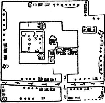 Uxmal, which, according to the Tutul Xiu account, was founded from Chichen Itza, shows, as regards the majority of its buildings, a very close correspondence with the Monjas group of the latter site. Most of the buildings exhibit the true Yucatec character, including the mosaic masks with projecting “trunks,” and pilastered ornament is also found. A few however do not[350] show these characteristics to the same degree, and present abnormal varieties of cornice, while others display signs of alteration and modification which imply at least that the site was inhabited for a considerable period. The most striking buildings, perhaps the finest in the true Yucatec style which exist, are the so-called “House of the Governor” (Pl. XXX; p. 358), the “Temple of the Magician,” peculiar in its oblong pyramid with rounded corners (Fig. 73, h; p. 321),[9] and the “House of the Doves,” distinguished by a vandyked roof-comb ornamented with open-work tracery. Lack of space forbids allusion to the many other Yucatec sites, such as Labna, Sayil, Kabah, and so forth, but it may be said that they embody similar forms of decoration such as the grotesque mosaic mask, and geometrical and pilastered ornament (Pl. XXV, 1; p. 332), though the structures can hardly be said to compare with those of Chichen Itza and Uxmal.