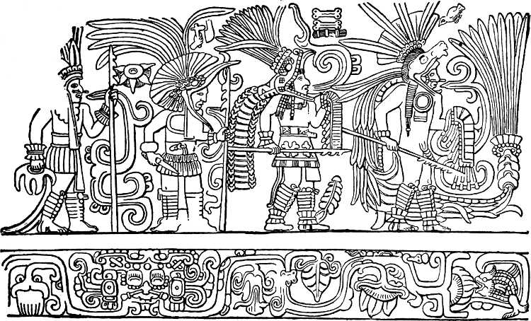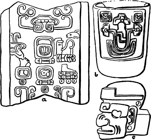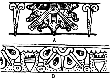 The chief objection to this theory of the origin and development of the Maya culture, as far as I can see, is that in Guatemala and Honduras no certain traces of a proto-Maya culture have as yet been discovered, but that the civilization springs, as it were, full-blown from the earth. The answer would be that the finest ruins have focussed all attention up to the present, and that earlier manifestations of the culture have not been[369] sought, while the difficulties afforded by environment and climate place serious obstacles in the way of systematic excavation. Further, the art itself affords many indications that it is based upon wood-carving, and the conditions are not favourable to the survival of any remains save those constructed in stone.