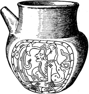 The Maya appear to have resorted occasionally to caves as dwelling-places, and certain investigations have been made in caverns at Copan and Loltun (immediately south of Uxmal), in Yucatan. The remains however do not imply that their occupation was of early date, and it is probable that the caves served as places of temporary refuge in times of war. This chapter would be incomplete without some mention of the peculiar bottle-shaped subterranean structures found at certain sites in Yucatan. These are known as “chultunes,” and, since they invariably occur at places remote from rivers, may almost certainly be regarded as cisterns for preserving a supply of water, though in some cases they have served the secondary purpose of burial chambers. They are lined with dressed stone or a coat of stucco, and the mouth is furnished with a stone ring which is closed by a slab. Careful exploration of the chultunes at Labna has been made by Thompson and reported in the “Memoirs” of the Peabody Museum.