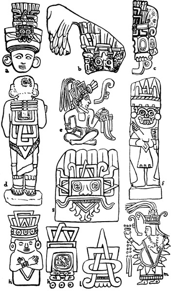 It is obvious that the two forms of culture described in the foregoing chapters, Mexican and Maya, were at least very closely related the one to the other; but it is equally obvious that the connection was closer between the Maya and the pre-Aztec inhabitants of the Mexican valley than between the former and the Aztec. Religion in both areas ran on similar lines, and the pantheons included certain more or less otiose high gods, and a rain and thunder agricultural-deity whose worship was of primary importance. The importance of blood-offerings, combined with the late introduction of human sacrifice, the existence of a ritual and solar calendar, both similar in nature, and the habit of constructing buildings of ceremonial importance on lofty pyramidal mounds or terraces are features common to both. Besides this, as far as the later Maya are concerned, we find traditions of a historical nature which make mention of places, such as Tulan and the Seven Caves, which occur in Mexican legends, and at Chichen Itza, where at least one section of the population traced their origin to “Tulan,” we have ruins corresponding exactly in style to those found at the pre-Aztec site Tulan in the Mexican valley. Other similarities relating to material culture are equally numerous, as well as similarities in art and symbolism. Many of these have already received attention, but, as a further illustration of the latter, mention may be made of a small detail which is of comparatively frequent appearance on sculptures throughout the Mexican and Mayan area. This consists of a trapezoidal[356] figure interlaced with a triangle or another trapezium, and occurs usually as a head-ornament. A series of its manifestations is illustrated in Fig. 86. Here the earlier monuments where it appears are represented by Copan (a), Menché (c), Piedras Negras (b) (for Naranjo see Pl. XXIII; p. 302); in Yucatan it occurs at Uxmal (g); on the fringe of the Mexican valley, at Tehuacan (d) and Xochicalco (e); in the valley itself, at Tenango (k), Xico (m), and, to the north, at Tulan (h); and in the Huaxtec country, at Teayo (f). The sign moreover bears a close analogy to that by which the Aztec expressed the period of a year (l), and the triangular portion of it is exactly similar to a conventional sun-ray. It is perhaps worth noting that at Copan, Uxmal and Teayo it is associated with the head of the rain-god. The significance of this symbol is obscure, but its presence over so large an area can hardly be due to coincidence.