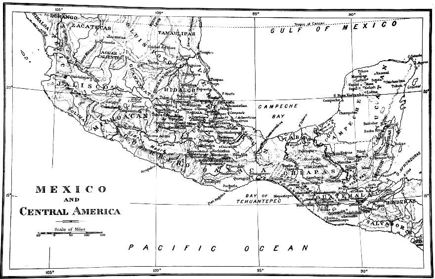 My original intention was to include in the present book a sketch of the archæology of Nicaragua, Costa Rica and Panama, but the material proved too great, and I have thought it better to deal thoroughly with the related cultures of the Mexicans and Maya rather than to give an incomplete or over-compressed picture of the archæology of a wider area. Even as it is I fear[iii] that certain chapters may have suffered from over-condensation, more especially that on the Mexican gods. However Mexican religion is in itself rather an intricate subject, and requires studying in considerable detail if a proper view of the life and culture of the people is to be obtained. Religion amongst the Mexicans was the mainspring of all private and public life, and few of the archæological remains cannot be brought into direct relation with it. Yet even Mexican religion is not as complicated as it appears at first sight; it is in reality the language, with its fondness for long compound names, which renders it so difficult a study to the amateur in the initial stages. I had also intended to add a bibliographical note, similar to that with which I concluded my volume on South America. But in view of the existence of an admirable bibliography in Dr. Walter Lehmann’s little monograph, “Methods and Results in Mexican Research,” I judged it unnecessary.
