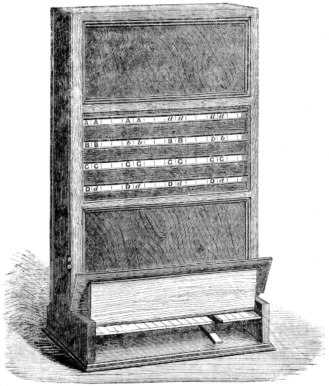 By the kindness of Mr. Harley, I have been able to examine Stanhope’s logical contrivance, called by him the Demonstrator. It consists of a square piece of bay-wood with a square depression in the centre, across which two slides can be pushed, one being a piece of red glass, and the other consisting of wood coloured gray. The extent to which each of these slides is pushed in is indicated by scales and figures along the edges of the aperture, and the simple rule of inference adopted by Stanhope is: “To the gray add the red and subtract the holon,” meaning by holon (ὅλον) the whole width of the aperture. This rule of inference is a curious anticipation of De Morgan’s numerically definite syllogism (see below, p. 168), and of inferences founded on what Hamilton called “Ultra-total distribution.” Another curious point about Stanhope’sxvi device is, that one slide can be drawn out and pushed in again at right angles to the other, and the overlapping part of the slides then represents the probability of a conclusion, derived from two premises of which the probabilities are respectively represented by the projecting parts of the slides. Thus it appears that Stanhope had studied the logic of probability as well as that of certainty, here again anticipating, however obscurely, the recent progress of logical science. It will be seen, however, that between Stanhope’s Demonstrator and my Logical Machine there is no resemblance beyond the fact that they both perform logical inference.