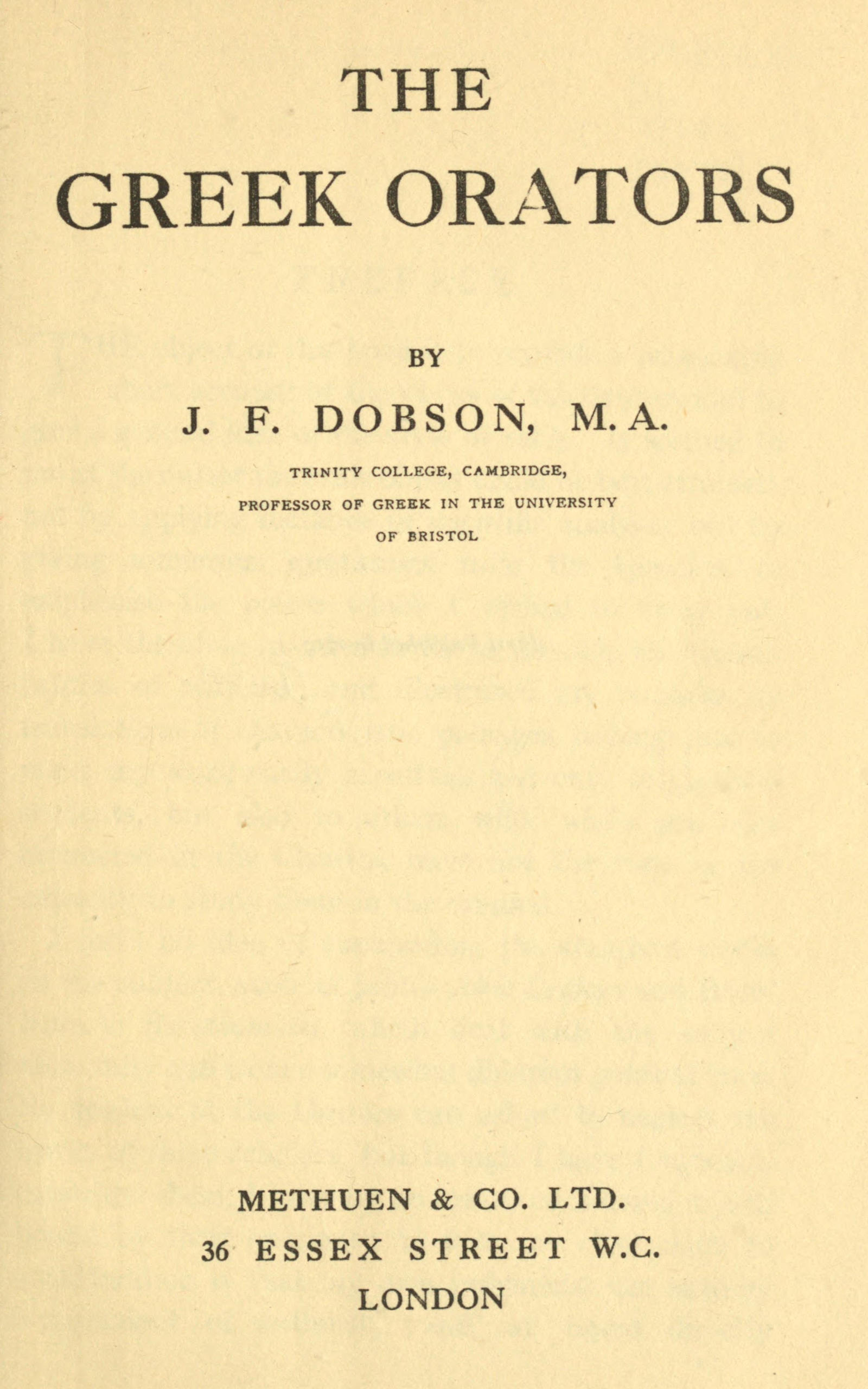 The object of this book is to provide a reasonably short account of the works of the Orators and to give a general idea of the style of each. It seemed to me at the outset that this object could be best attained, not by applying methods of scientific analysis, but by giving numerous quotations from the speeches to emphasise the points which I wished to bring out. I have therefore avoided as far as possible the technicalities of criticism, and illustrated my remarks by translations of characteristic passages, hoping thus to make my work easily accessible not only to classical students, but also to others who, while generally interested in the Classics, have not the time or the capacity to study them in the original.