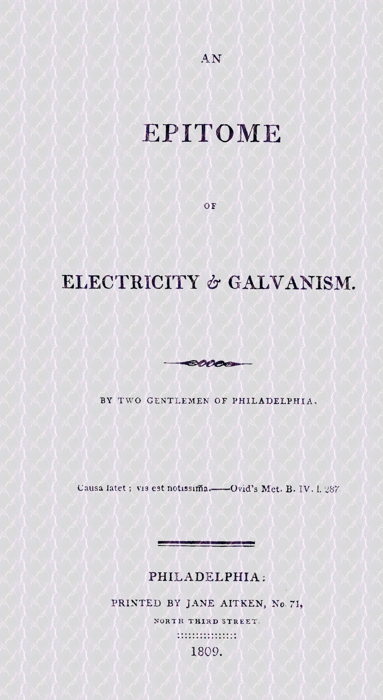 “An Epitome of Electricity and Galvanism. By two gentlemen of Philadelphia. Causa latet; vis est notissima.—Ovid’s Met. B. IV. l. 287.”