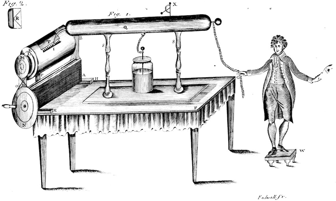 In France, the Abbè Nollet attempted to measure the distance to which the electric shock might be carried, and the velocity with which it passes. At one time he electrified 180 of the guards in the king’s presence; and at another the whole community of the grand convent of the Carthusians at Paris, forming a line of 900 toises, by means of iron wires between every two persons; when the whole company, upon the discharge of the phial, gave a sudden spring at the same instant of time, and all felt the shock equally.