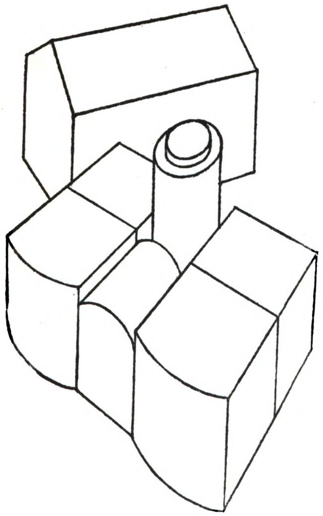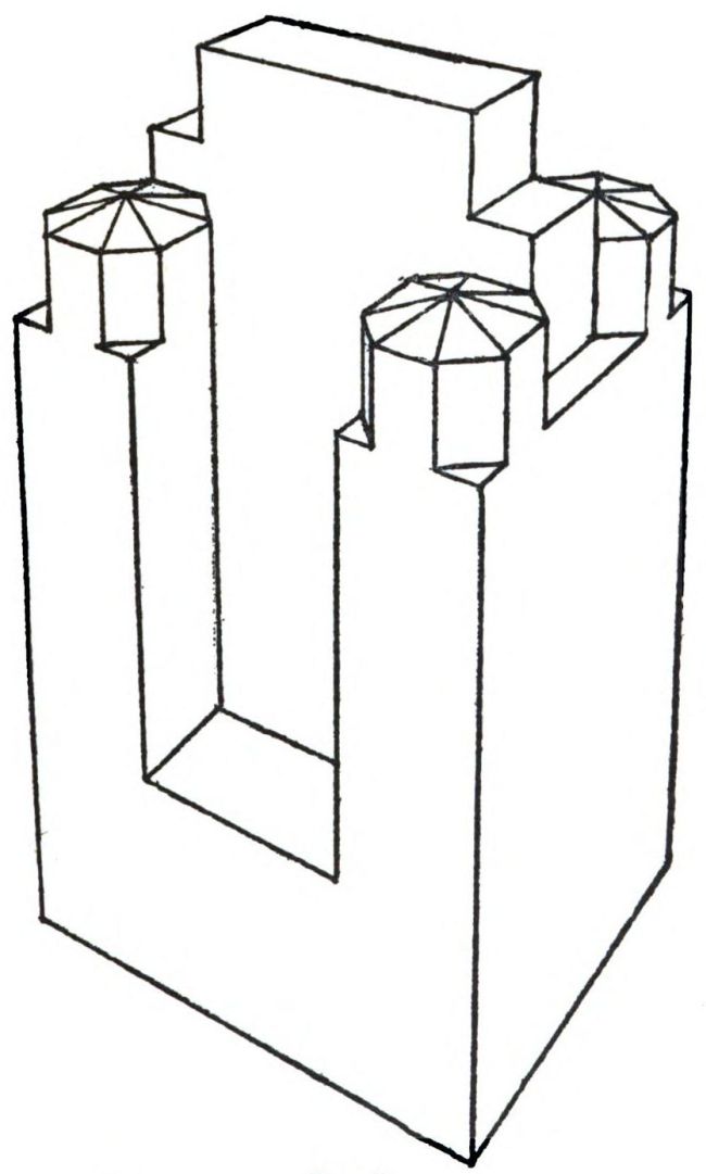 A zoned building, consisting of an H-shaped arrangement of parallelepipeds with two external areas. The influence of the American zoning law is visible in the upper part only. It accounts for the stepping-back of the central block and the octagonal tower that surmounts each corner. (Fraternity Clubs Building, New York, by Murgatroyd and Ogden.)
