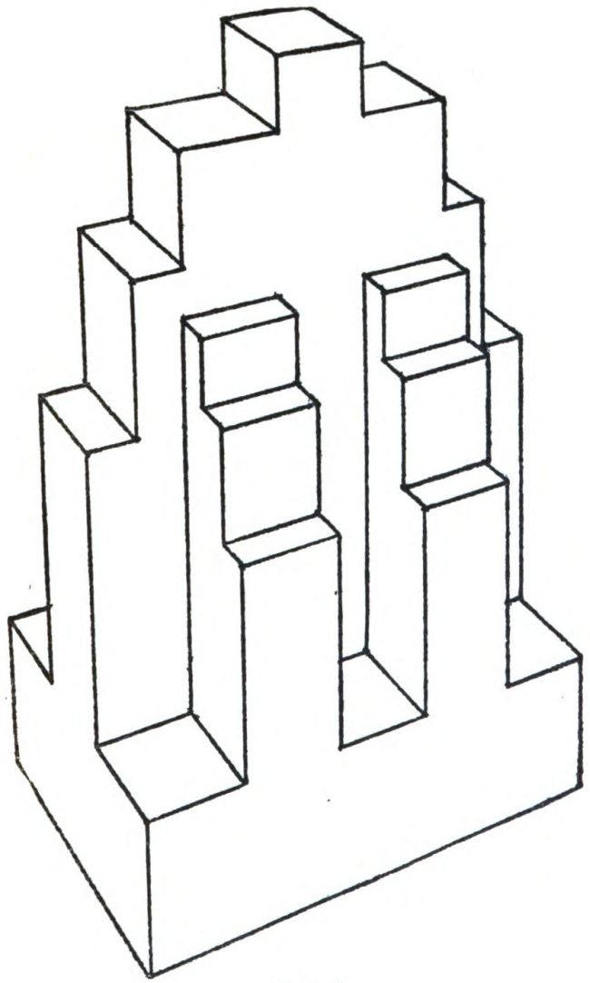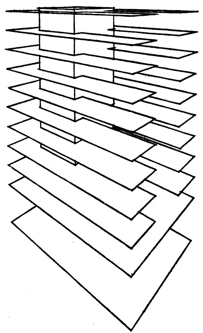 A zoned building, more recent than the last, showing the American zoning law in full operation. The central parallelepiped here runs across the two others, thus forming six external areas separated by six buttress-like projections. Each of these projections is stepped back in obedience to the zoning law. (Bell Telephone Building, St. Louis, by Russell and Crowell.)