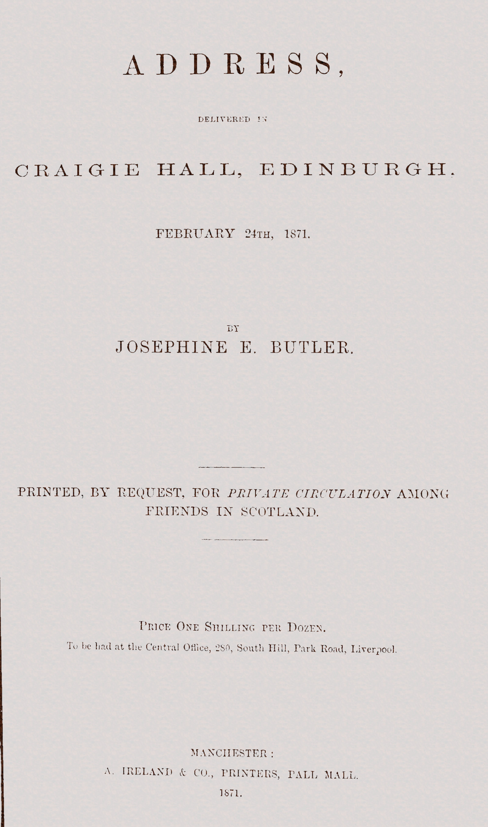 I was asked this morning when it was that my thoughts were first directed to this subject concerning which we are met together. As I am here among friends and fellow-workers only, I may answer this question, which is personal to myself. It is many years ago that I first became acquainted with this system as it existed in Paris. I was one of those persons—they were few, I believe—who read that very brief debate in the House of Commons in 1866, when Mr. Henley and Mr. Ayrton alone, but clearly and boldly, entered their protest. It was in that year that the knowledge first broke upon me that this system, which I had so long regarded with horror, had actually found a footing in our England. It seemed to me as if a dark cloud were hanging on the horizon, threatening our land. The depression which took possession of my mind was overwhelming. A few days ago I found a record of those days, in an old manuscript book long laid aside. In turning over its leaves, I found a note of that debate in the house, the date, and a written expression, which I had since forgotten, of a presentiment which at that time filled my mind, that in some way or other I should be called to meet this evil thing face to face—a trembling presentiment, which I could not escape from, that, do what I would, I myself must enter into this cloud. I find there recorded also a brief prayer, beseeching that if I must descend into this darkness, that divine hand, whose touch is health and strength, would hold mine fast in the darkness. I can recollect going out into the garden, hoping that the sight of the flowers and blue sky might banish the mental pain, but it clung too fast for a time for any outward impression to remove it; and I envied the sparrows upon the garden walk, because they had not minds and souls capable of torment like mine. But now, when I look back, I see that that prayer has been heard—the divine hand has held mine—often when I knew it 5not. And, friends, God can give more than power to bear the pain; there is a positive joy in His service, and in any warfare in which He who conquered sin and death and hell goes before us, and is our reward.