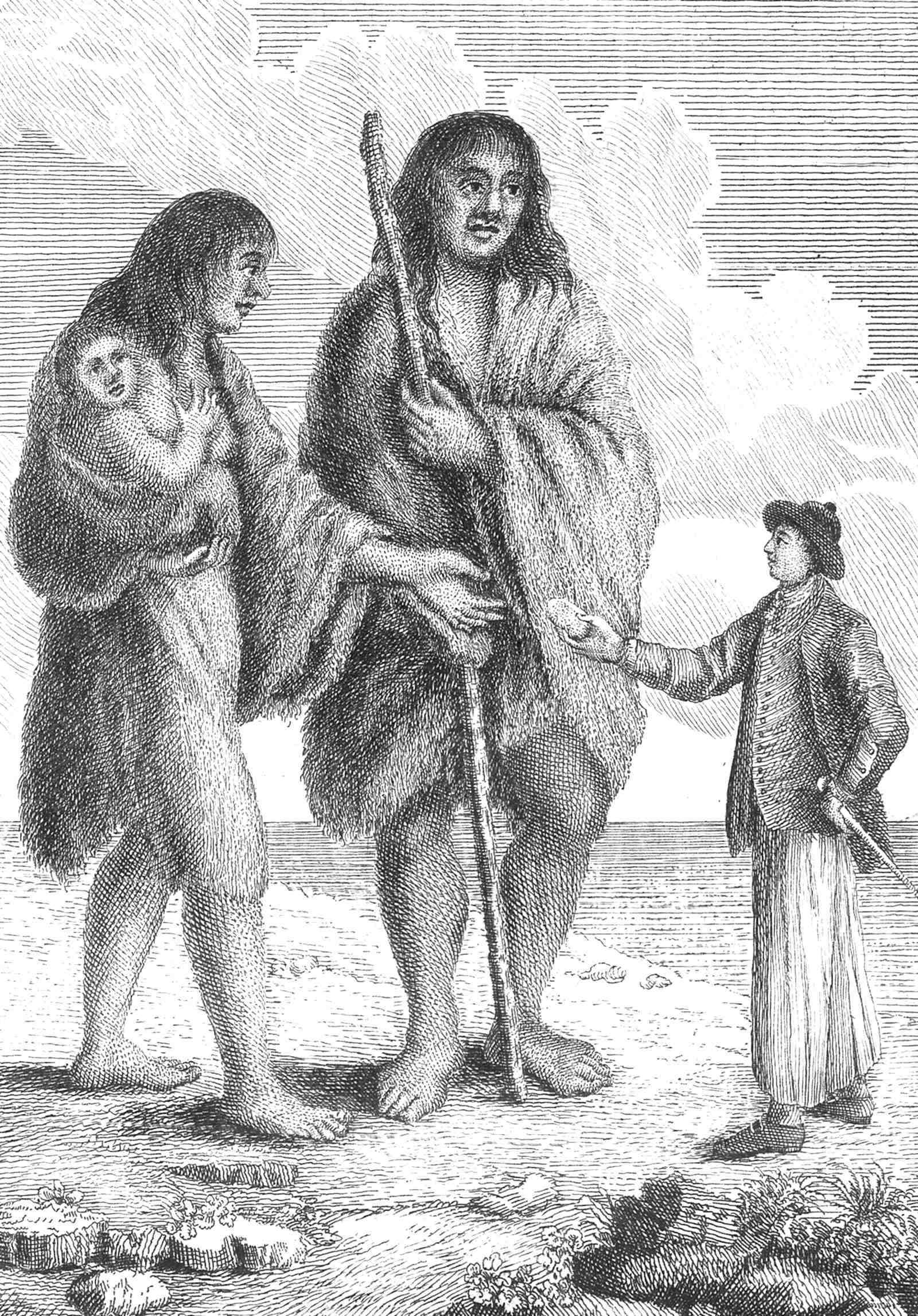 Very few other Particulars are come to my Knowledge, except that they were clothed in Skins of Beasts, and had their Eyes painted of different Colours; that they had no Weapons, but Spears pointed with Fish-Bones, that they devour Fish raw, and that they showed great Repugnance to taste any Liquids offered to them by the Captain; and that though they were too polite absolutely to refuse his Toast, they spit the Liquor out of their Mouths again; whether from Apprehension of Intoxication or Poison, is not certain: However it looks as if they had some Notion of such European Arts. What is more remarkable; the Weather being very severe at that Season, the 11whole Colossal Troop seemed as sensible of the Cold, and shivered like us little delicate Mortals of Six Feet high. They had a few Giantesses with them, but as the Captain did not survey them with the small End of his Spying-Glass, I do not hear that he was much struck with their Charms.