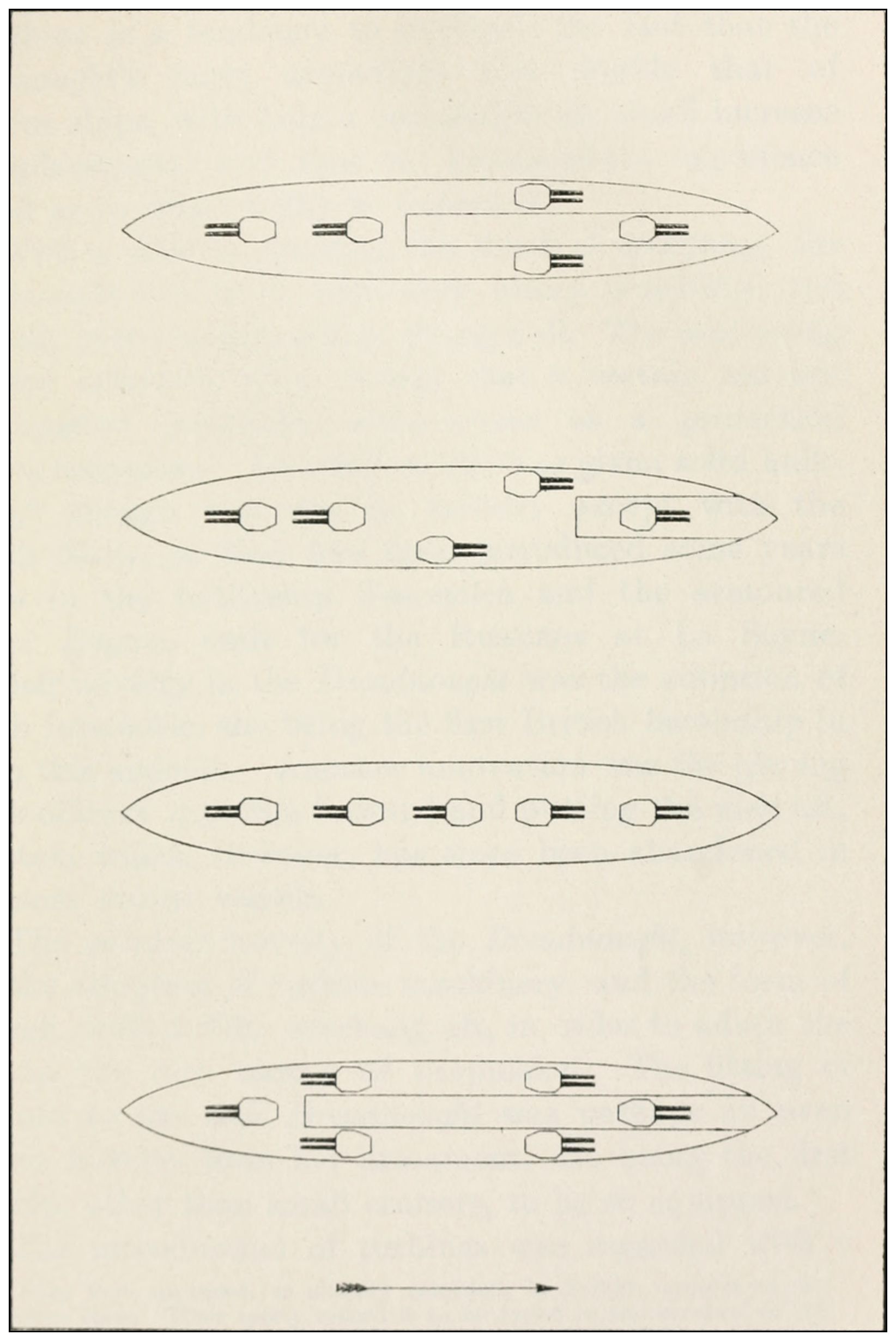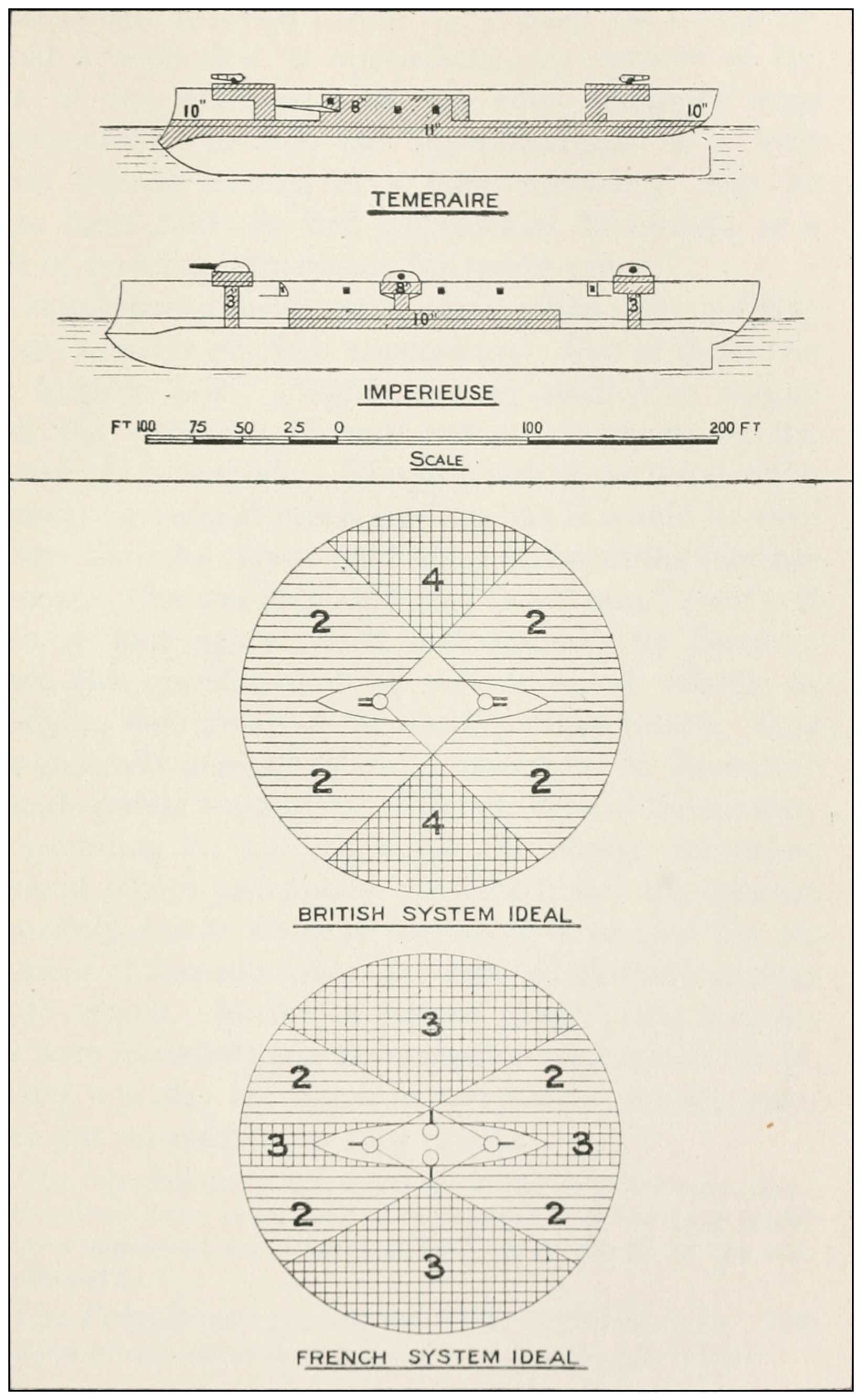34 In the Chinese ships Ting Yuen and Chen Yuen, built in Germany in 1882 with big guns en échelon, the former had the port big guns foremost, the latter the starboard ones—presumably an appreciation of and an attempt to overcome the inherent defect of the échelon system—the two ships being intended to fight in company, and so have one of the two always in the best fighting position were the enemy anywhere on the beam or quarter.