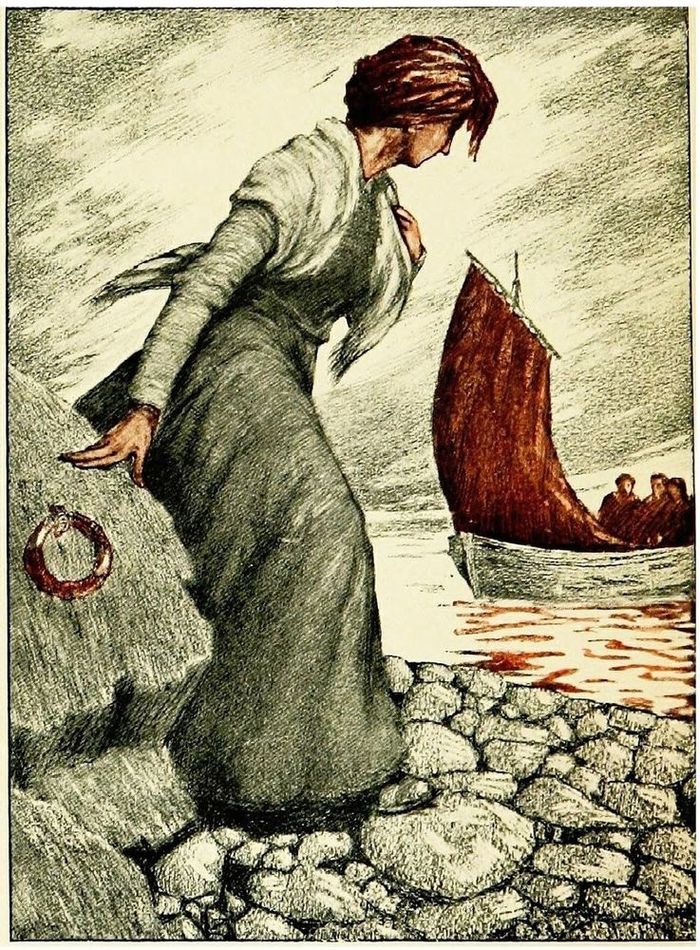 Minnie Walsh was generally a silent, quiet girl, but when she spoke of this Feish, she brightened up out of a dulness which made her enthusiasm the more striking by contrast. Its glow was caught by her hearers, and often gave a livelier turn to assemblies of the neighbours, whether on the swarded edges of the bog, basking in long, honey-coloured sunbeams, or gathered closer, on rough-hewn stools and benches, about a less distant hearth-fire. Mention of the jigs and rinca-fadhas would set the young folk dancing, and their elders’ memories were stirred into another sort of activity, producing fragments of half-forgotten ditties, and familiar phrases long disused. For Lisconnel had hardly any Irish speakers in those days except Pat Ryan’s very old mother, who so seldom said anything, that her language might indeed be a matter of conjecture. She pricked up her ears one evening upon hearing her son exchange certain guttural greetings with Joe Sheridan,[Pg 35] and she suddenly declaimed in her corner a long Gaelic ballad, relating the adventures of a Princess, a Giant, and an enchanted steed, which seemed but gibberish to some of her audience, and to the rest would have seemed so, only that it being a widely spread folk-tale, they were able to guide themselves through it by the clues of a word or name recognised here and there. At the end of it, Widow M‘Gurk sighed profoundly with a regretful satisfaction, and said: “Sure now the sound of it does me heart good. It must be a matter of fifty year since ould Kit Maher would be singin’ the very same at me poor father’s house away in Asherclogher. But, bedad, if I got a sight of a one of them reels, Minnie says is to be in it, I’d consait I was a little girsheach again, I would so.”