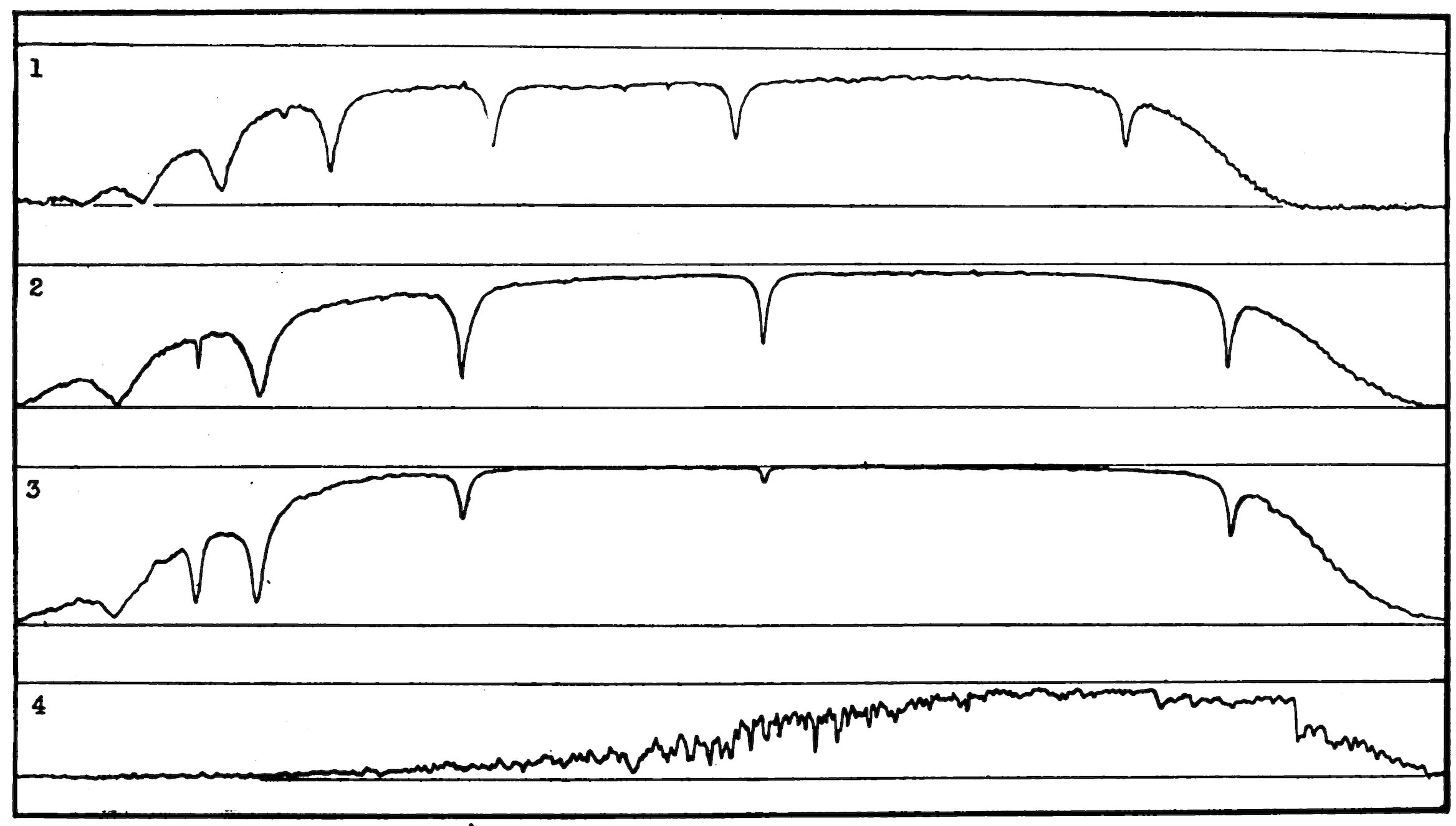 Figure 1.—Microphotometer tracings made from the spectra of four stars. The names of the stars, and the sources of the analyzed spectra, are as follows: (1) α Canis Majoris (Sirius), Harvard objective prism spectrum, (2) α Lyrae (Vega), slit spectrogram, Detroit Observatory, (3) α Aquilae, slit spectrogram, Detroit Observatory, (4) β Pegasi, slit spectrogram, Detroit Observatory. The violet ends of the spectra are to the left.