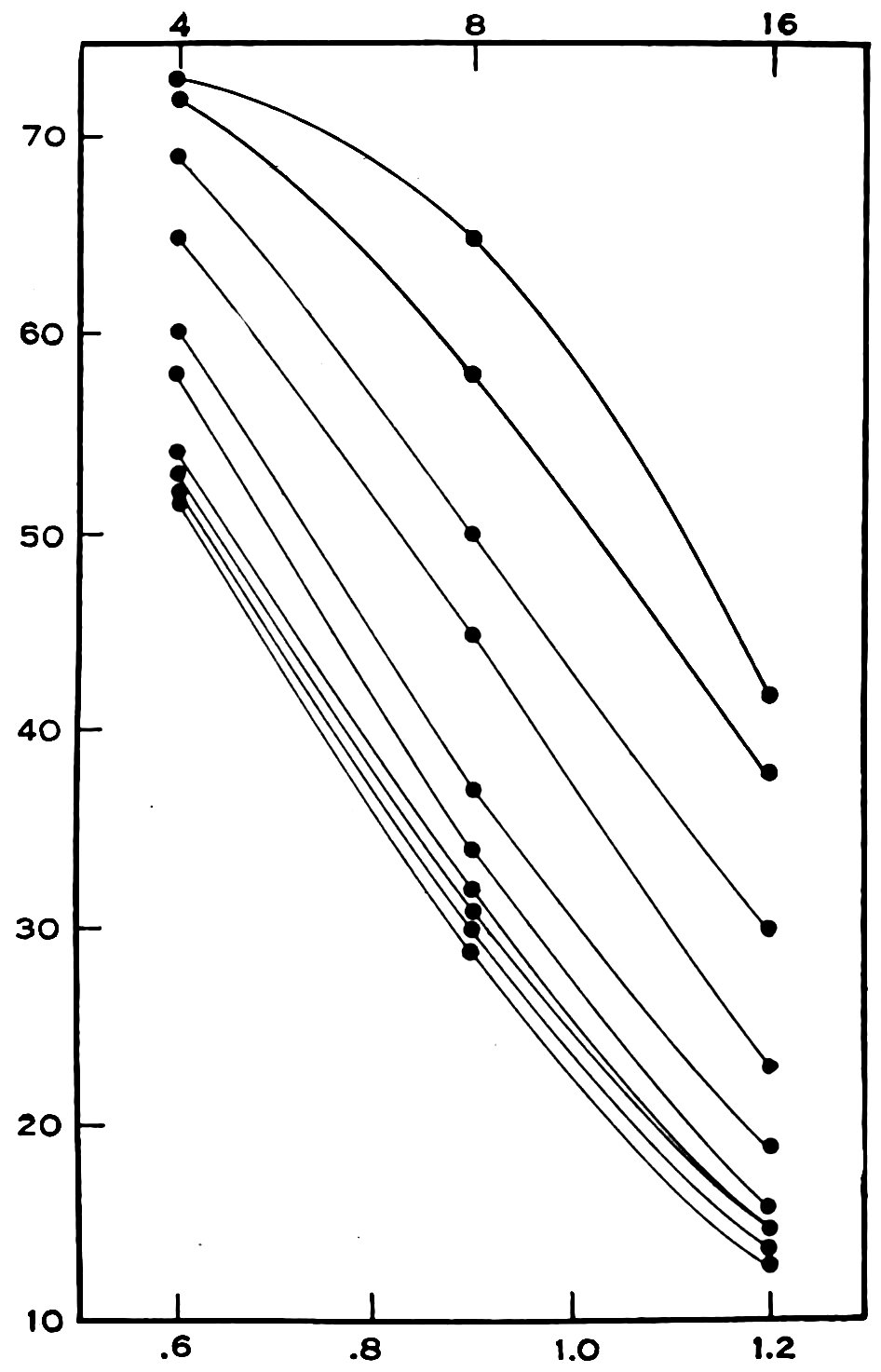 Figure 3.—Relation between galvanometer deflection (representing plate density) and aperture (representing light intensity), from measures of the microphotometer tracings made from the apertured spectra of α Lyrae, MC 20790. Ordinates are galvanometer deflections in scale divisions, abscissae are (above) apertures, (below) logarithms of apertures. Smooth curves are drawn joining the points corresponding to the same wave length, for the three apertures represented.