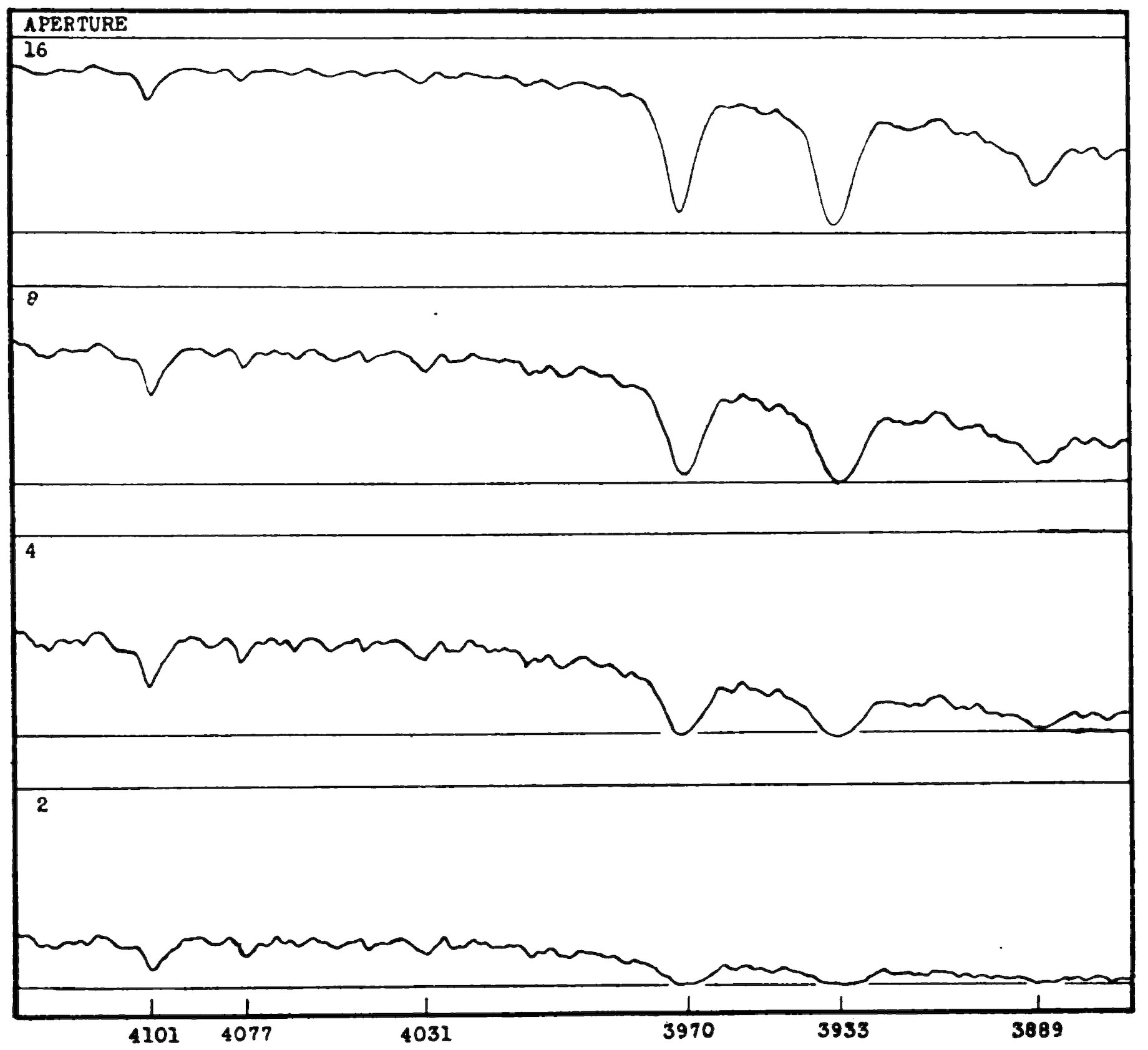 Figure 5.—Microphotometer tracings made from a portion of Harvard apertured objective prism spectra of α Persei. The different apertures used are indicated on the left margin. A few of the more important lines are marked on the lower edge of the diagram.