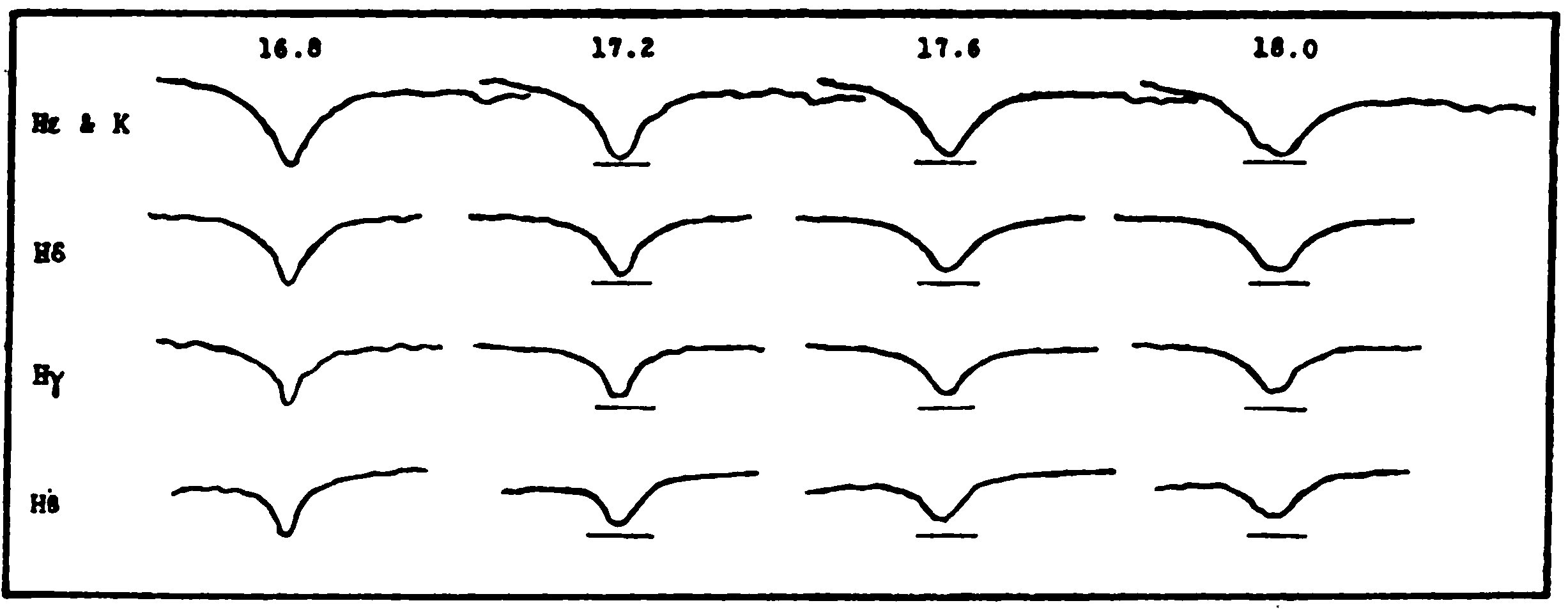 The microphotometer tracings on paper prints were measured with respect to the reference marks. Lines, representing “darkness” and “clear film,” were ruled from end to end of the tracing, and across the absorption lines a curve was drawn, completing the curve of the neighboring continuous background. For early type stars this background curve can be drawn without ambiguity; but when the spectrum is rich in lines, the course of the unlined continuous background is largely a matter of judgment.