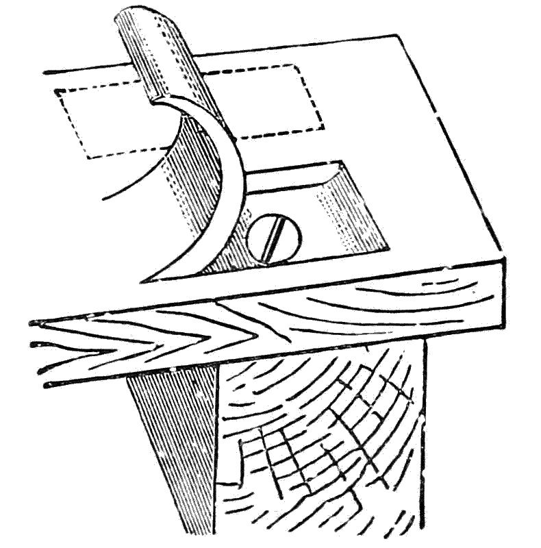 Wherever possible and suitable I would advise the use of glue in putting up finish, and I may here remark to the workman, that after a little practice in the use of glue and a little knowledge of its worth and capabilities, he will prefer it, to nails or screws where he can apply it; further on I will give a few hints and suggestions on the proper methods of using glue in house finishing. Of course, I am well aware that the use of nails and screws is a necessity in wood-finishing, but where the work is to be left natural color, or stained and polished, there should not be the slightest suspicion of a nail or screw head, and to meet this condition the skilled workman resorts to several expedients to hide the fastenings among which are the following. These methods, which are similar, are called “sliver-nailing,” or sometimes, “chip blind-nailing.” In the first method, shown at Fig. 1, the[11] wood is raised with a firmer chisel and the screw or nail is then put in place and driven home. At Fig. 2, the “sliver” or chip, is raised with a gouge. In the first instance a sharp knife should be employed to draw lengthwise with the grain two deep cuts the width of the chisel, as this keeps the sides of the chip from splitting. The chisel should be set at a steep angle at first till the proper depth is reached, and then made to turn out a cut of even thickness until there is room to drive in a screw or nail. If too sharp a curve is given, the “sliver” is likely to break apart in being straightened out again. In Fig. 2, I show how the “sliver” is raised by using a gouge. To do this nicely a gouge about three-quarters of an inch across the face should be used and the curve should be quick. In this case no knife cut is needed, as the corners of the gouge will cut as it progresses.